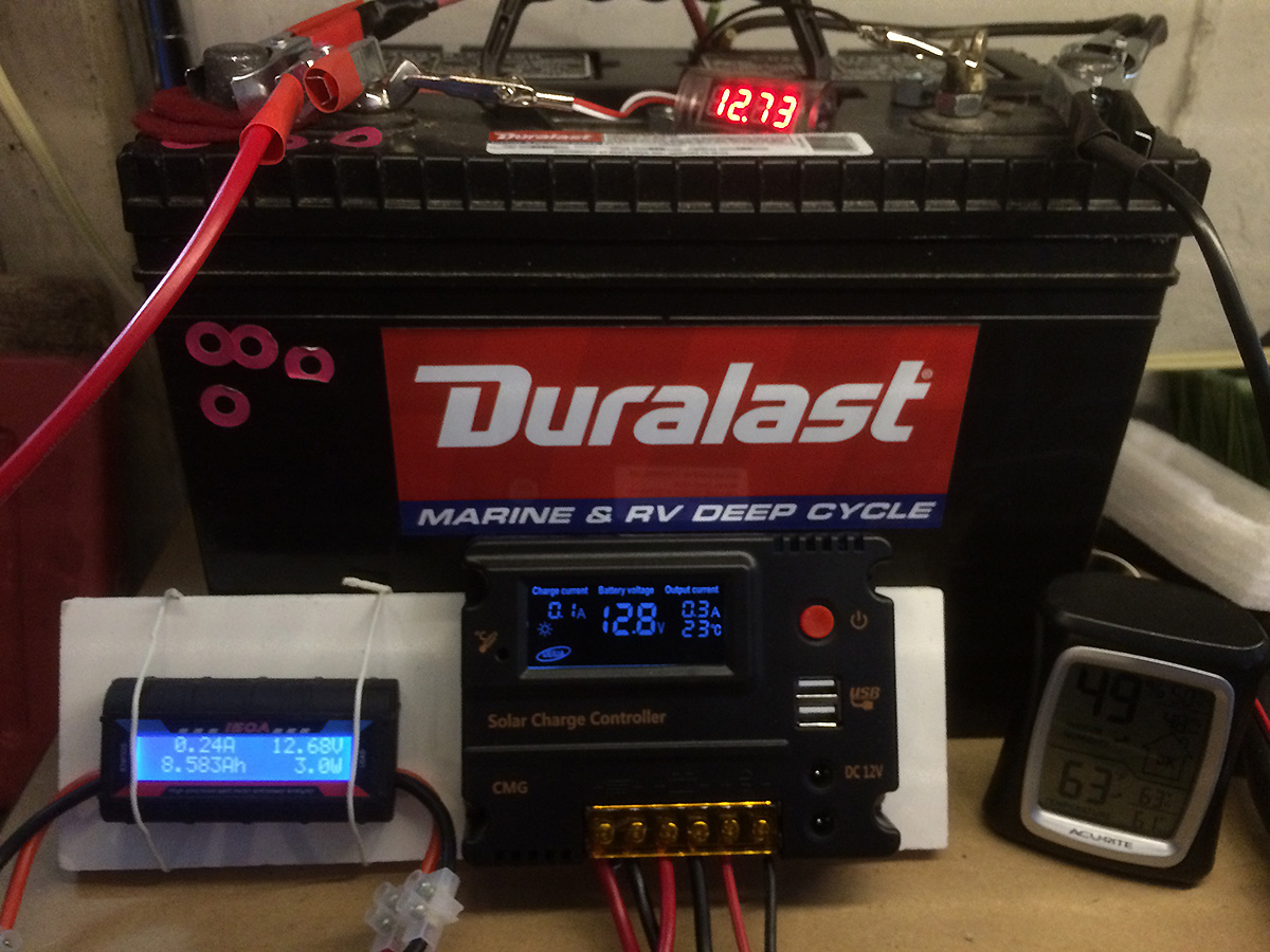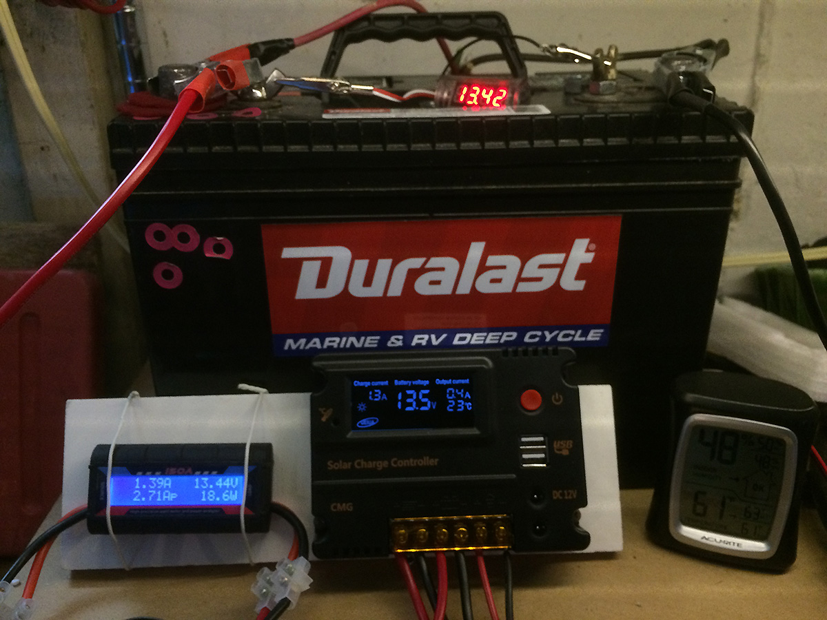 i was done by 2:20pm, went around checking the solar battery statuses one last time. the 50W panel was actually pulling more watts than the 100W panel. that's because the 50W is mounted higher up, while the 100W is mounted lower, the maple tree shadow covering much of it. the voltage on the 85Ah deep cycle marine battery in the basement is never as good as the 35Ah battery in the sunroom. one reason is because the 35Ah is new, so it has a higher capacity. another reason is because the 85Ah actually does work, when i run the water pump outside it draws power from this battery. it wouldn't be so bad if the 100W was running close to efficiency, but it's mounted vertically outside and most of the time i only see single digit wattage. once the growing season is finally over, we can clean the raised beds and mount the 100W on an incline so it has a better angle to the sun.