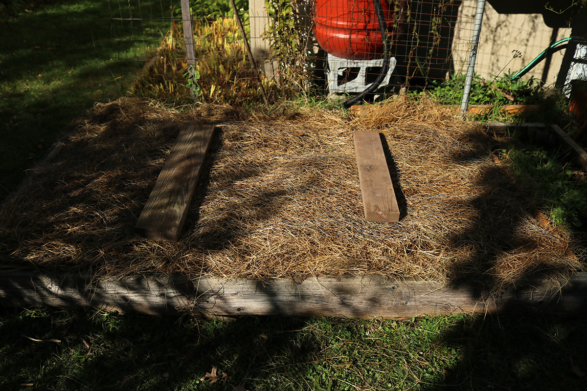 so for the first hour i worked in the grow room. the second hour i spent outside, watering the front and backyard. not having hailey there meant i could work peacefully, not having a dog barking at me to run the sprinkler. critters have yet to discover the garlic bed, but it's only a matter of time. hopefully i planted the cloves deep enough (6") and put a thick enough layer of saltmarsh grass to protect the garlics when squirrels do eventually begin digging.