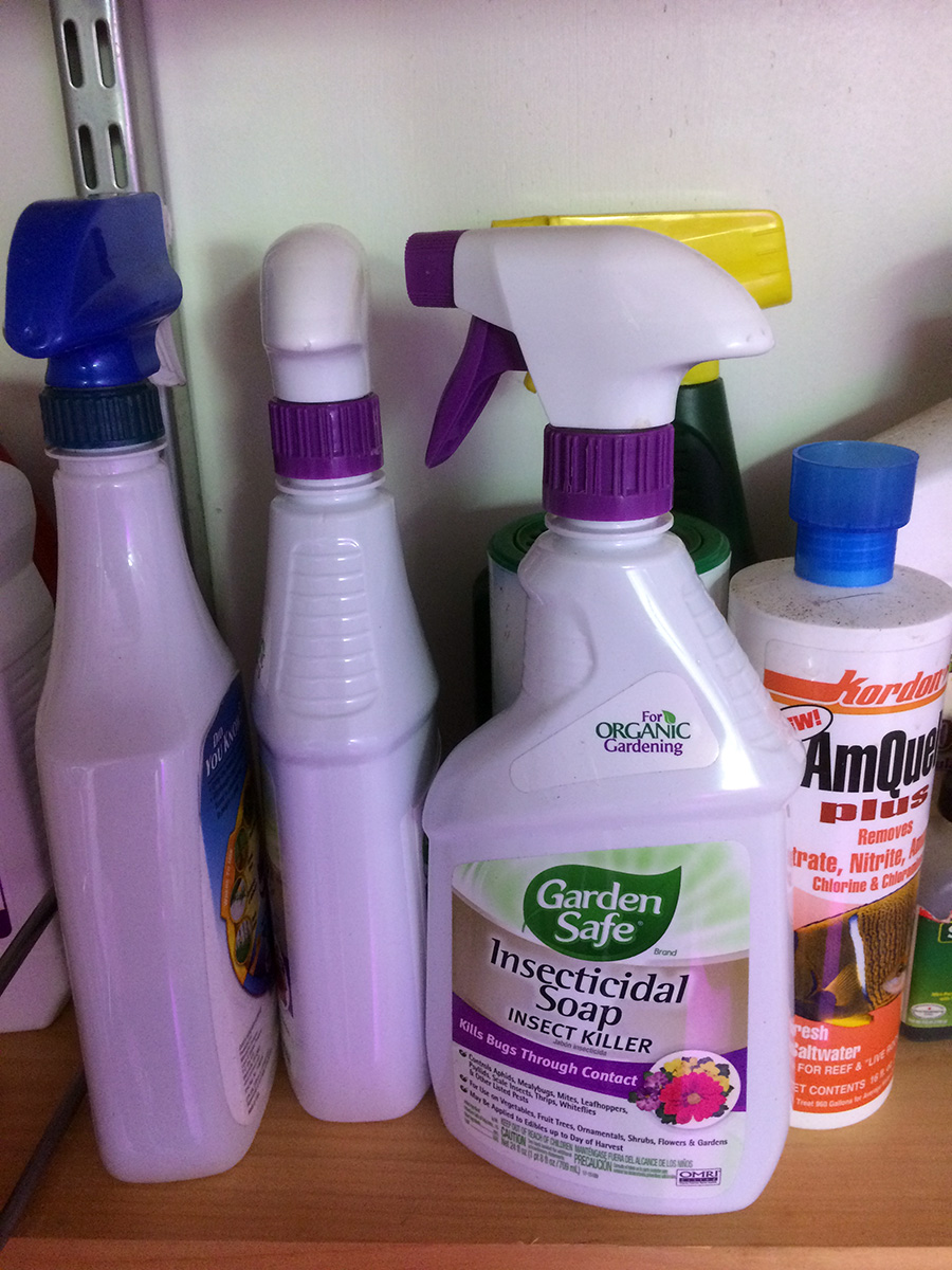 my original plan was just to water the grass patches and make sure squirrels/chipmunks haven't been digging in my garlic bed, but i ended up doing a lot of work in the grow room. it's awfully buggy in there, from fungus gnat infestation in the dragon fruit cactus soil (my father had been overwatering with mosquito bit treated water but he also added some fertilizing solution which killed all the bacteria), to hitchhiking leafhoppers, to the occasion caterpillar slowly eating the foliage. i also discovered that aphids had been attacking the ficus topiaries because i noticed everything around that area was sticky. i ended up moving the ficus outside and spraying them with insecticidal soap. i also moved the basil and sprayed soap on that as well. the gardenia looked dry so i took it outside to water and give it a nice shower, as well as a nearby jasmine that had sticky leaves from the ficus.