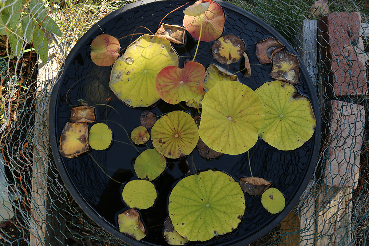 i'm waiting for my lotuses to die, or their leaves anyway. once that happens, i can finally relocate them to the basement for winter storage. maybe a killing frost will hasten their demise. i'm just dying to see the tangle of underwater lotus roots.