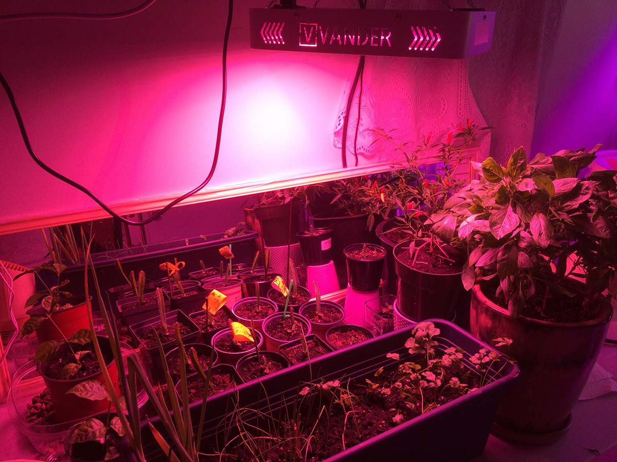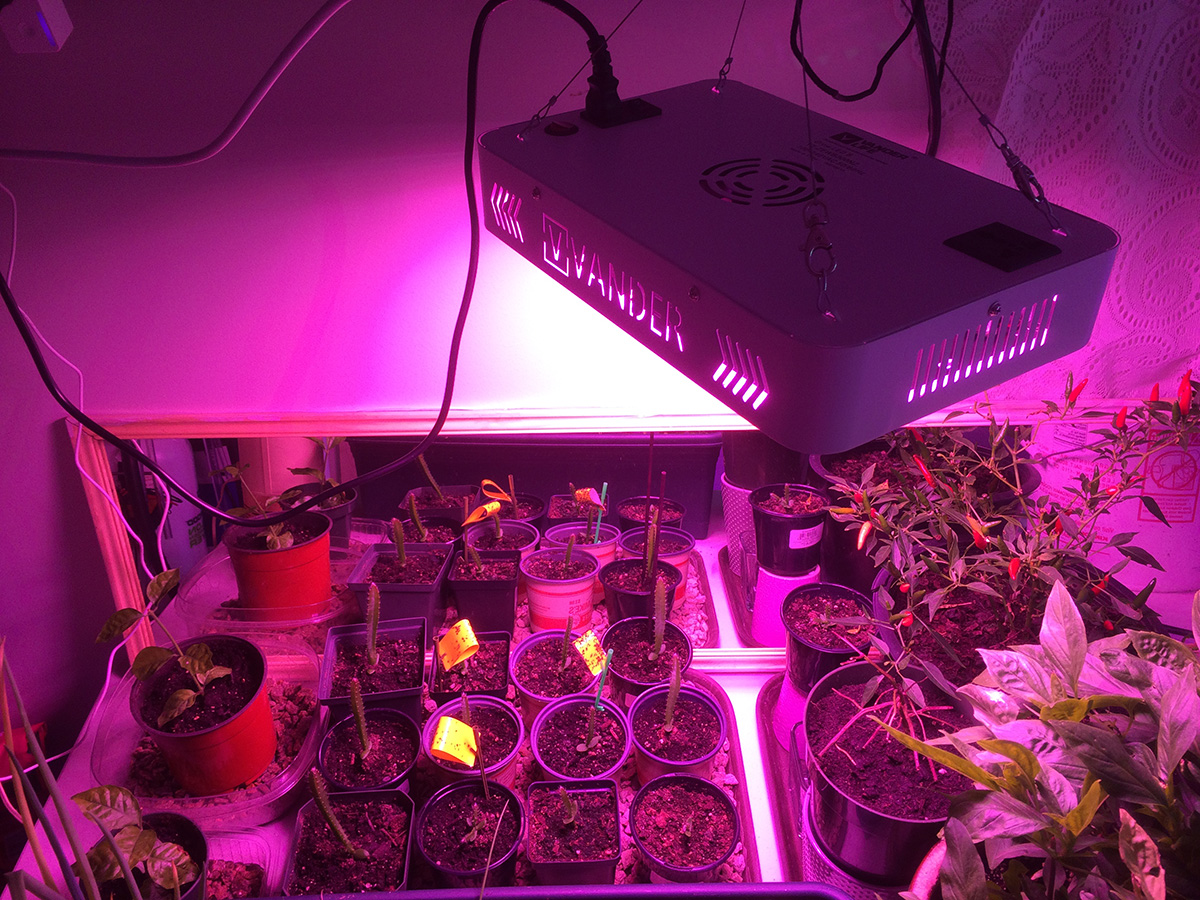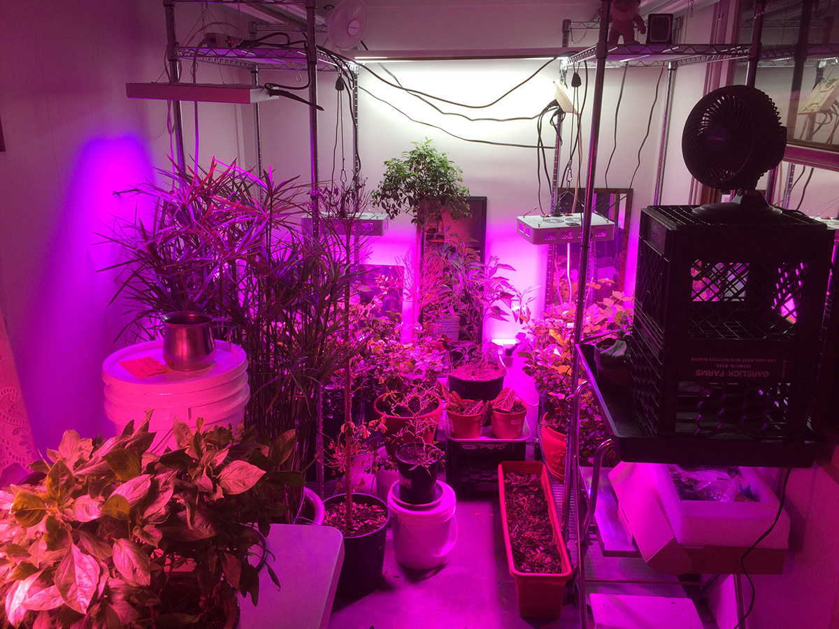 i brought my small oscillating fan with me today and installed it in the basement grow room. we currently use a large freestanding oscillating fan, but it takes up too much space. with the smaller fan, we were able to tie it upside down from one of the steel shelves, clearing up more room to walk around in.