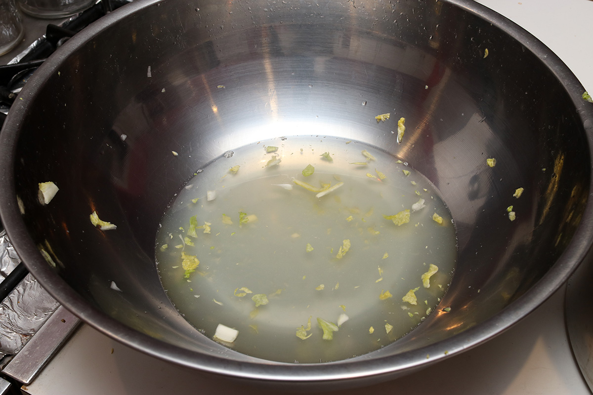 i have a very large (16" diameter) stainless steel commercial mixing bowl that i thought would be big enough to contain my vegetable ingredients (napa cabbage and daikon radish) but after i finished cutting i quickly realized i had way too much. i ended up splitting the ingredients into two, the other half in a large stock pot. i split the salt portion equally between the two containers and left the cabbage and radish to reduce, coming back every hour to turn the vegetables. the reduction would take 6 hours, i figured i'd start assembling the kimchi sometime after 8pm.