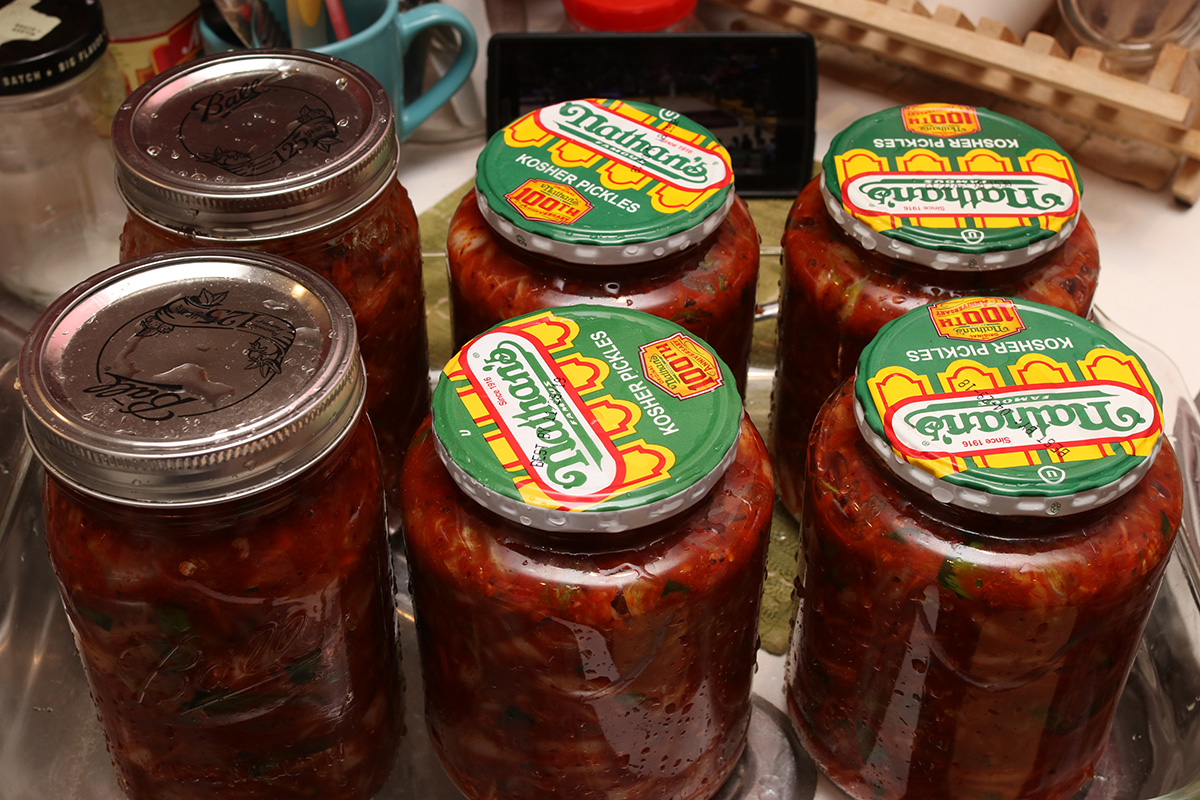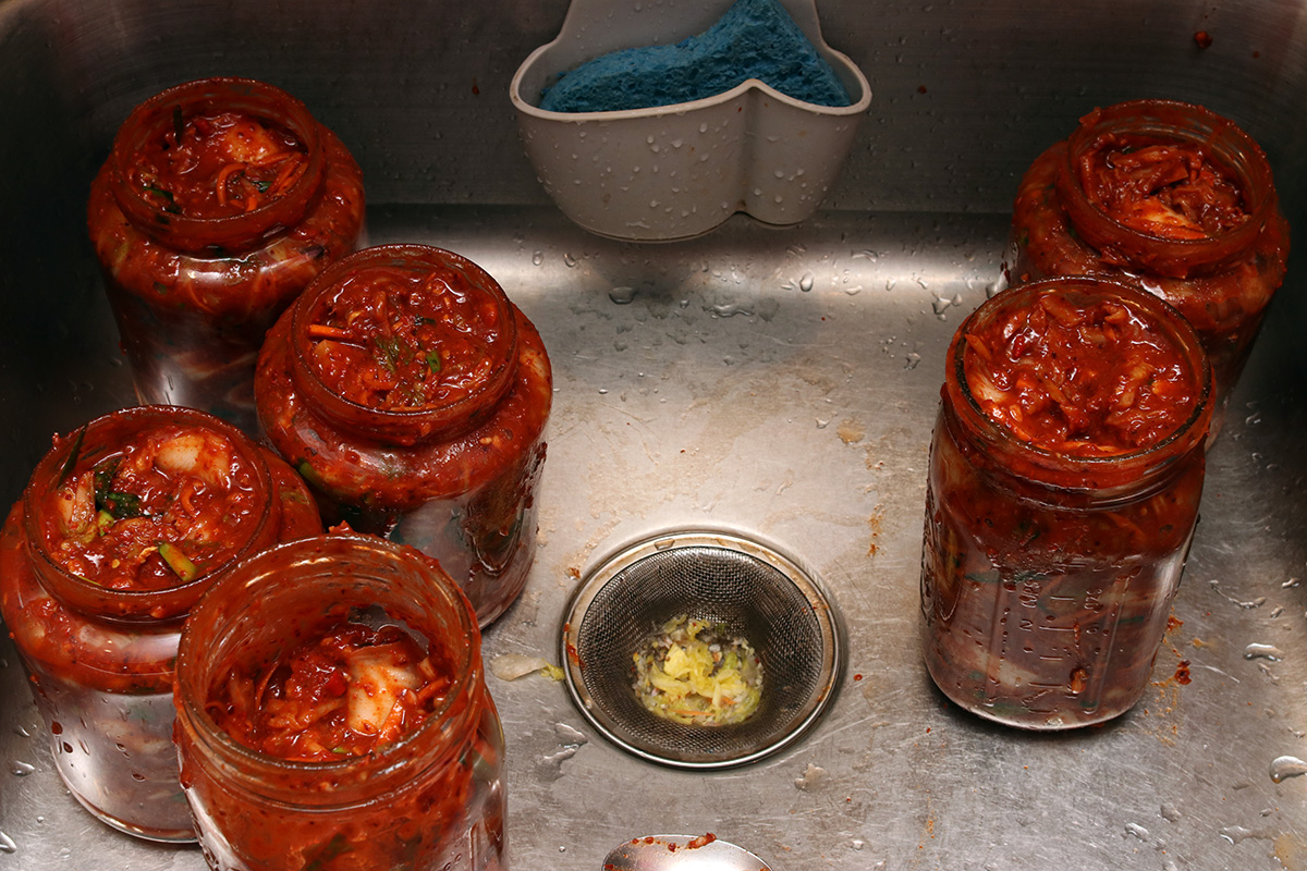 over the sink, i scooped the kimchi into my glass pickle jars. i only had 4 pickle jars, the 2 other jars were 32 oz. (quart-size) wide mouth canning jars. i finally finished canning all the kimchi by 9:30pm. unlike my usual kimchi, which are canned "dry," this particular batch had more of a pepper paste so there are no air pockets inside the jar, just a solid mass of kimchi vegetables and red pepper paste. i'm curious to know what they taste like once properly fermented.