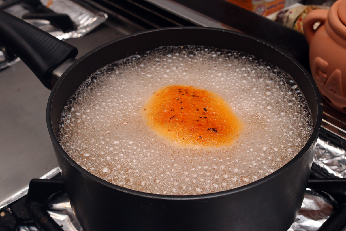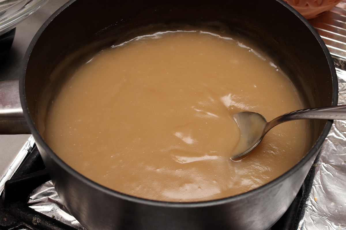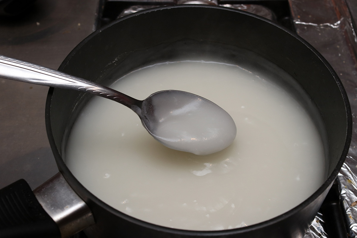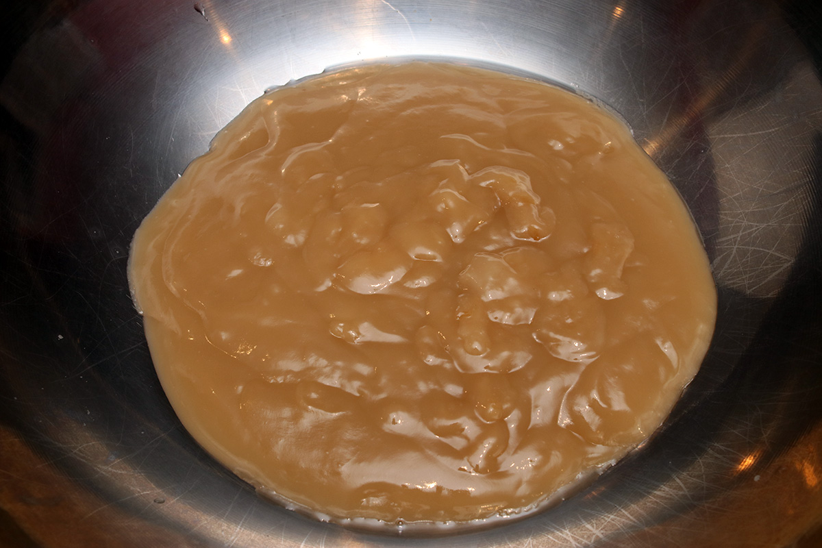 an hour before (7pm) the vegetables finished reducing (8pm), i started making the glutinous rice porridge, since it needed time to cool down before it could be mixed with the other ingredients. for the amount of kimchi i was making, it seemed like i needed to make a fairly large amount of porridge, 3 cups. i thought it was a bit much, but decided to follow the recipe as written, figuring at least for the very first time i should follow the directions. the water and rice flour quickly turned into the consistency of white glue. it was thick, and bubbling, and i was after of getting splattered with hot porridge. to that i added some brown sugar and continued heating until the sugar had dissolved, turning the porridge light brown. it actually tasted pretty good, reminded me of the flavor of boba tapioca balls.
