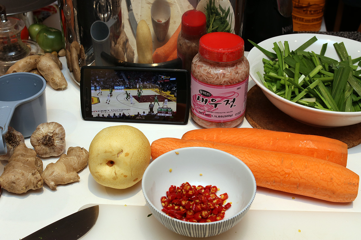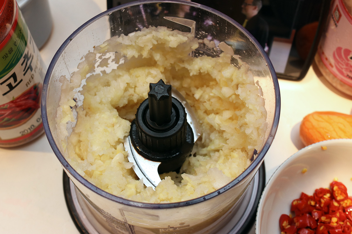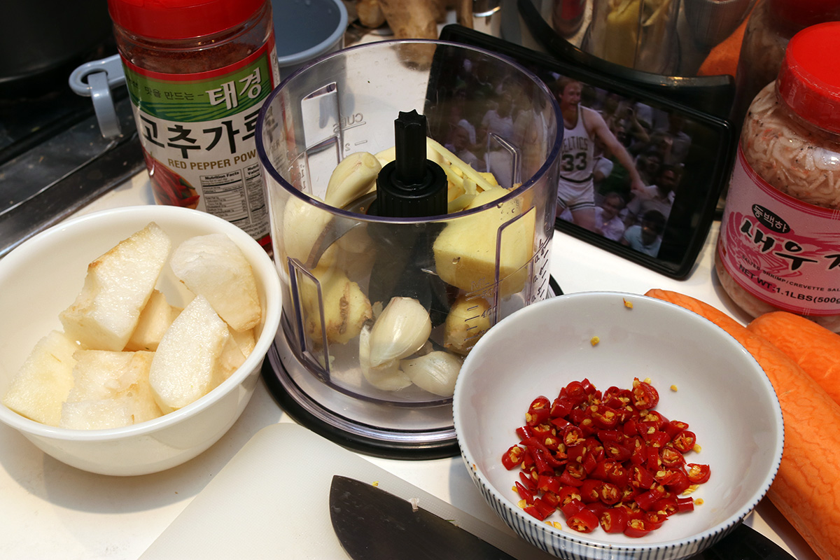 i started preparing the rest of the ingredients. the ginger, garlic, and asian pear had to be peeled and processed in the ninja blender. originally i was only going to use a single head of garlic because my mother complained my last batch of kimchi had too much garlic, but the homegrown red korean garlic i was using were kind of on the small-medium size, so using 2 was kind of like still using 1 large head of garlic. i was also going to julienne the ginger, but decided to chop it in the food processor because i was lazy. since i was incorporating so much sugar from the glutinous rice flour porridge, i was hesitant about adding the asian pear. but since i had it, i added it anyway, would be processed regardless, not like anyone would be able to tell the difference.