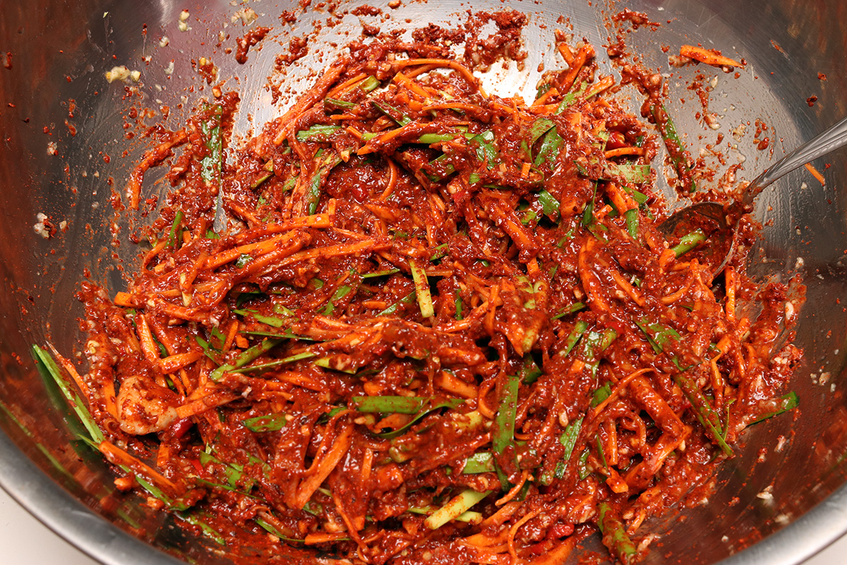 in the end i followed my own recipe in reducing the cabbage and daikon radish but created a glutinous rice porridge hot pepper powder paste to mix with the reduced vegetables.