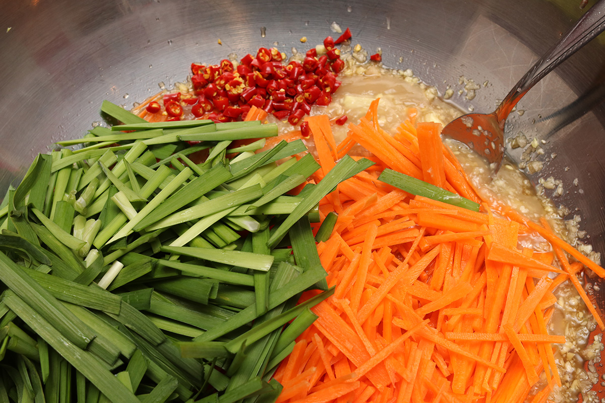 another new ingredient was the addition of carrots. i had carrots when i made my poggi whole-leaf kimchi, though it contributed nicely to the overall kimchi medley. i'd weighed out 1.37 lbs. of carrots ready to be julienned. chopping them up into matchsticks not only took a long time but was also dangerous, and a few things i cut into my fingernails. i ended up stopping after i collected 3 cups of julienned carrots. the maangchi recipe only called for 1/4 cup of carrots.