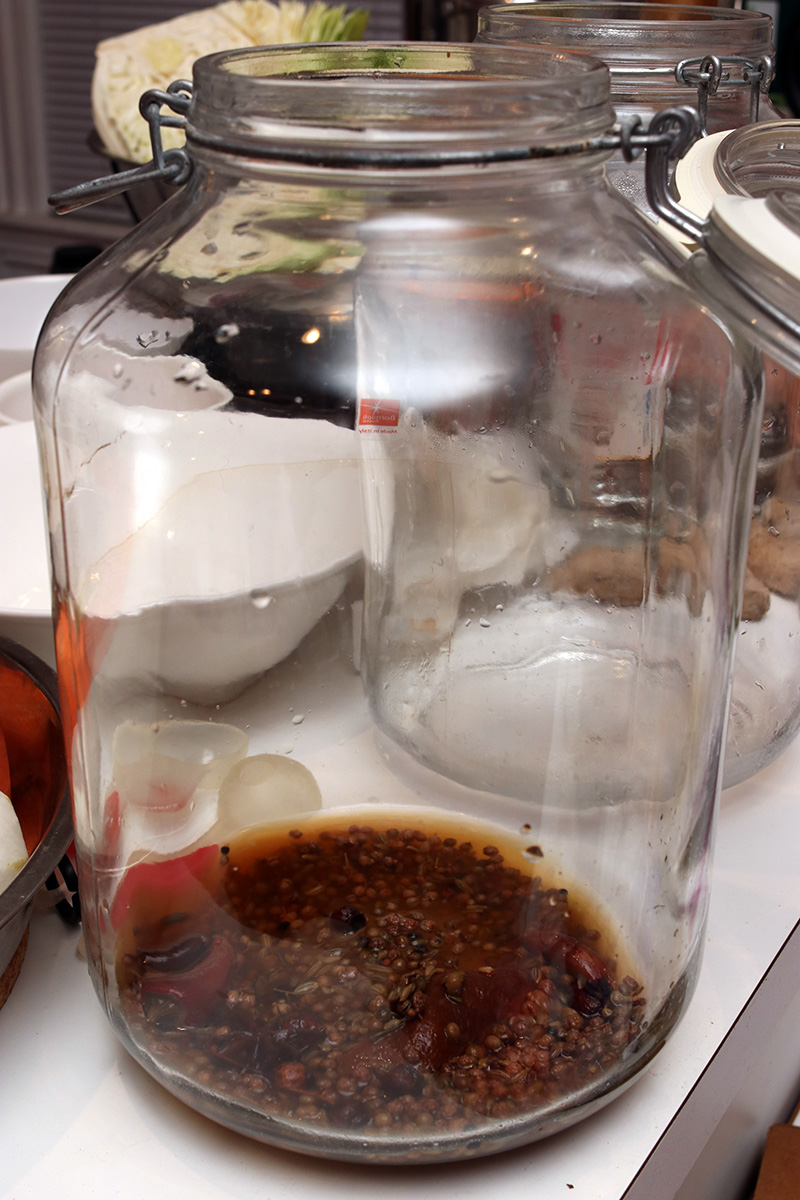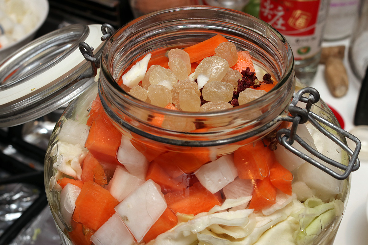 i had two jars, the only different was the first jar contained sichuan paocai spices. it looked like maybe not everything would fit, but i've had more ingredients before (sept 2017) and managed to stuff everything into just 2 jars, so i knew it was possible. once i filled the first jar, i began pouring in the brine solution, 9 cups. it didn't look like the liquid was coming to the top, i was hoping the vegetables would settle eventually, or enough fermentation gas gets produced to push the water level up. i added the rock sugar and poured in 1/8 cup of chinese baijiu before clamping closed the lid.
