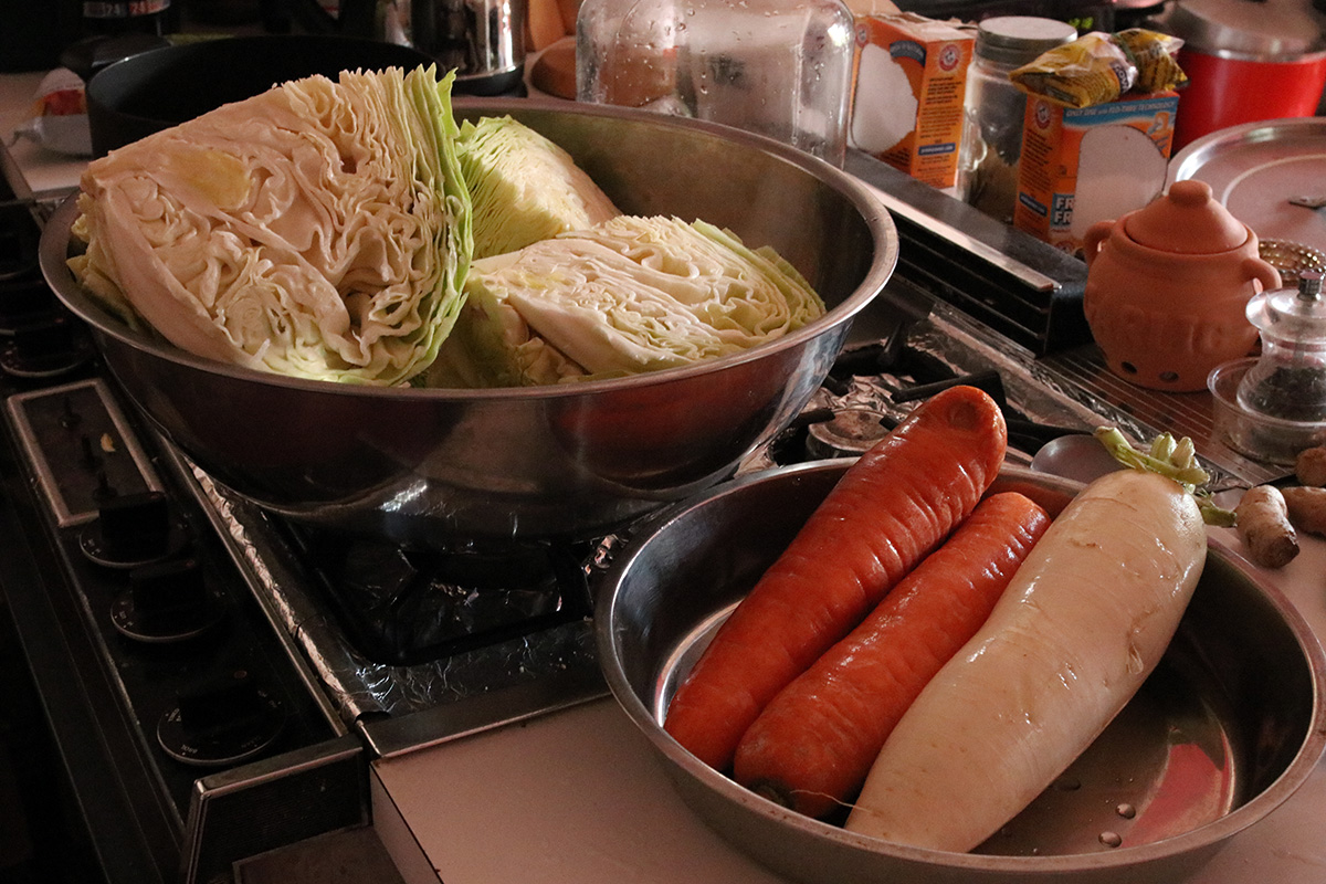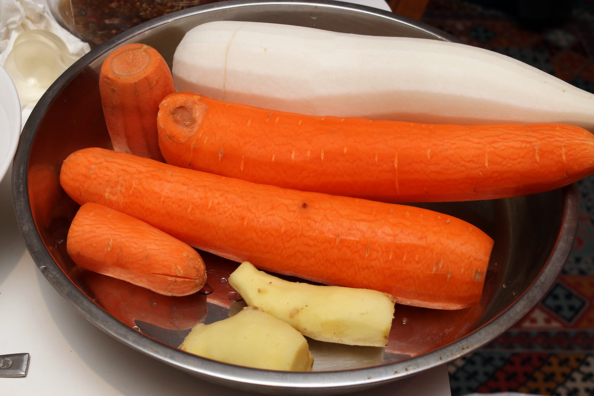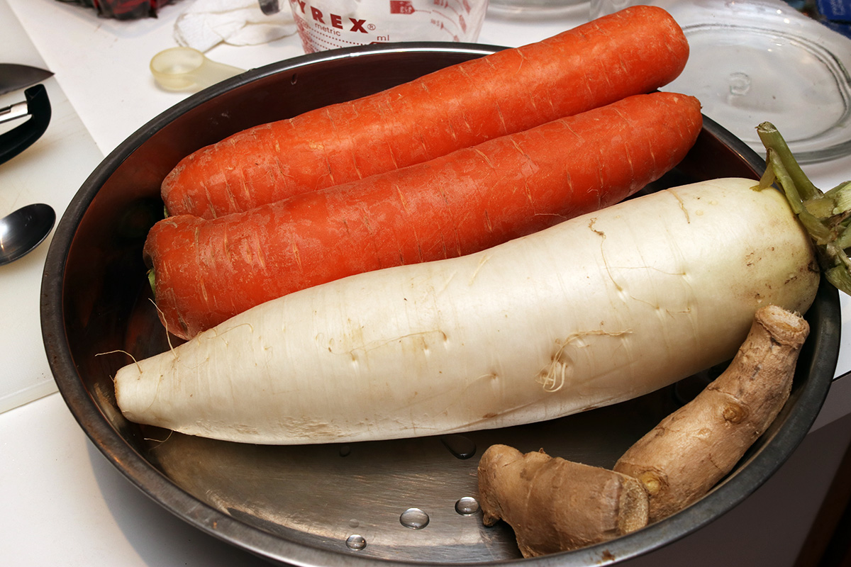 6.36 lbs. chinese cabbage 1.50 lbs. daikon radish 1.62 lbs. carrots 3 oz. ginger 4 dozen thai chili peppers |
