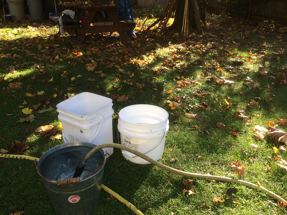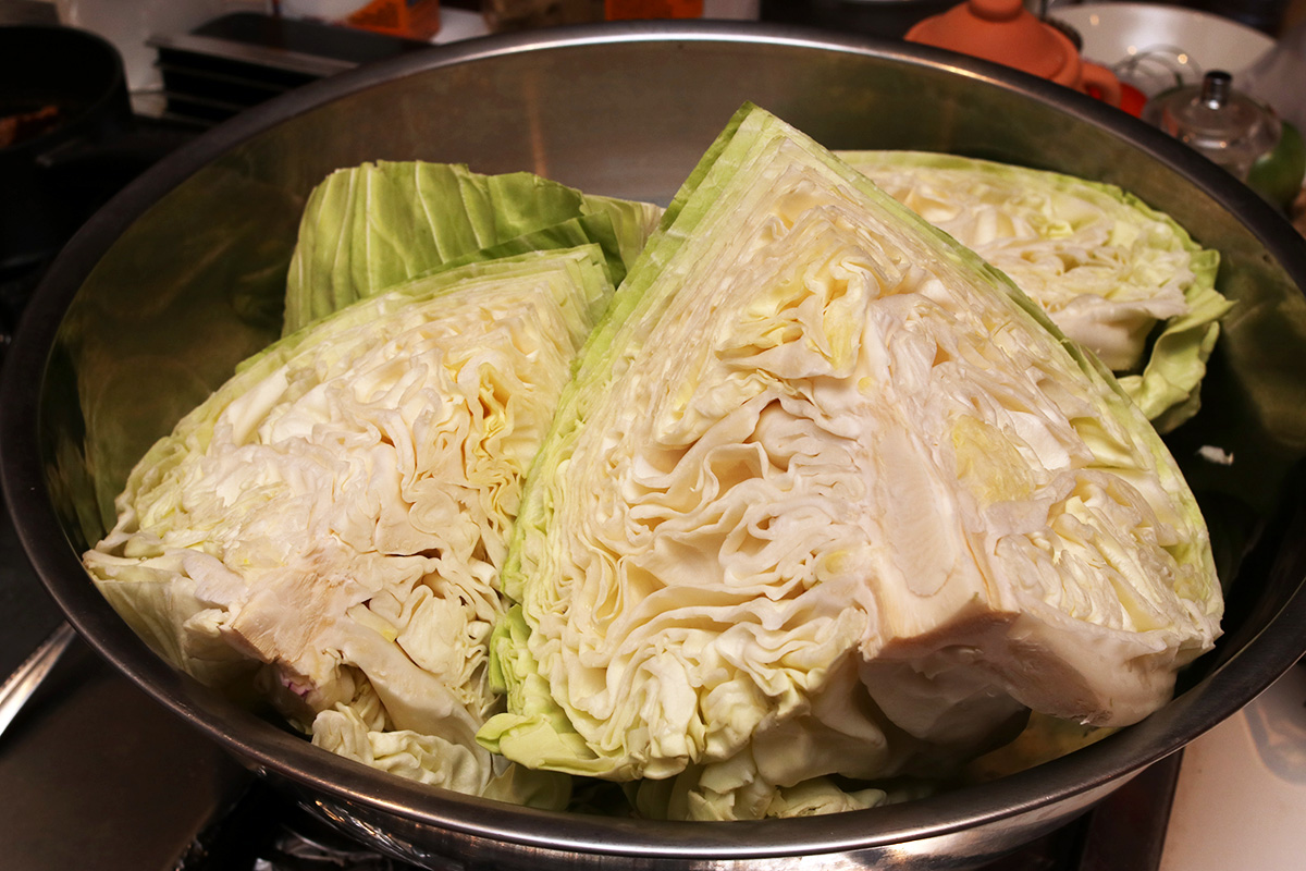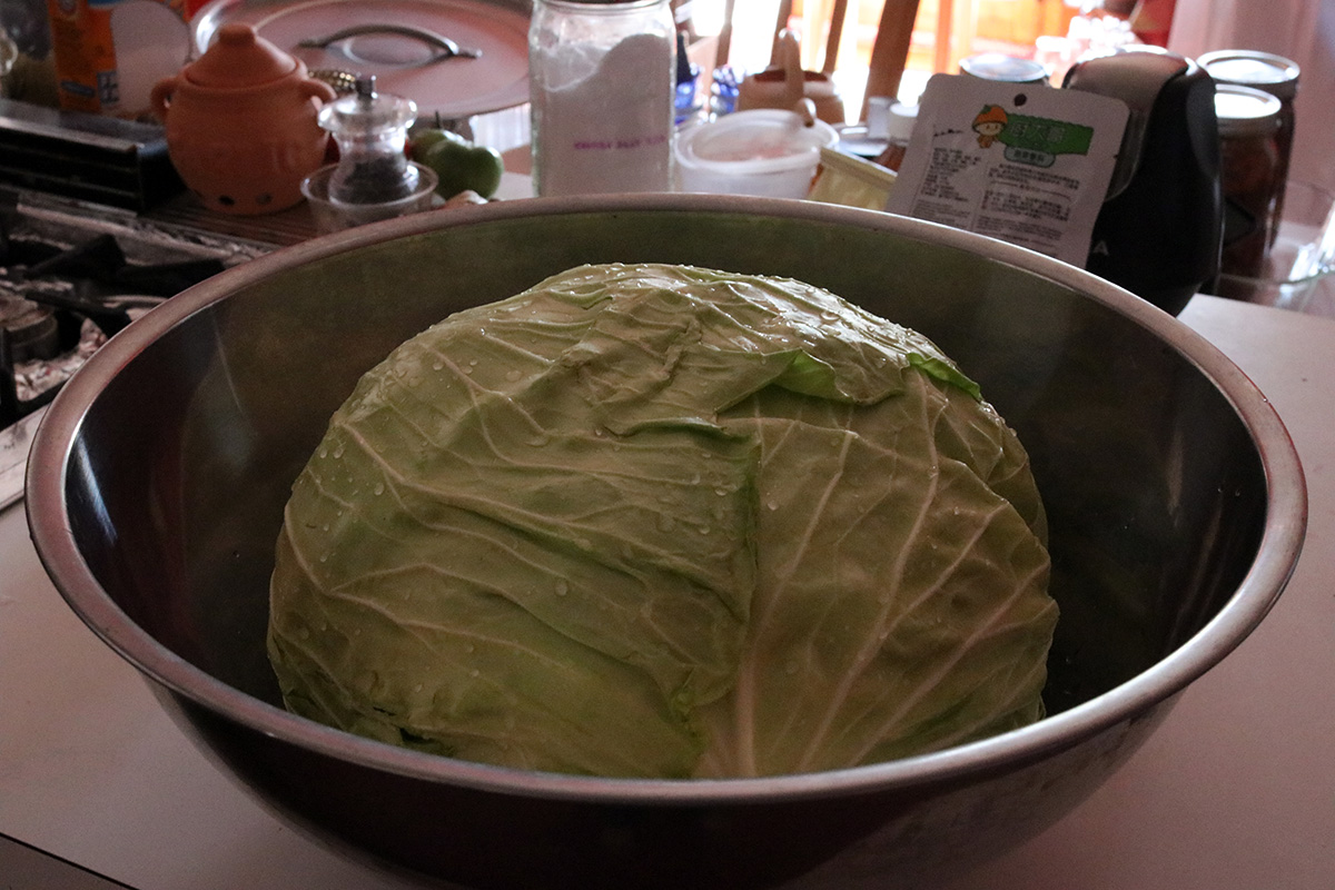 i was about to head out to belmont to bring in my lotuses (temperature would drop into the 20's later this week) but decided to prep my vegetables before leaving. i had a 6lbs. chinese cabbage. i've worked with heavier cabbages (8lbs.) but that was multiple cabbages, this was just one cabbage. after giving it a quick rinse, i chopped it into quartered and left it in the mixing bowl to dry. i washed the carrots and daikon radish, waiting to peel them when i return. finally, i made the brine solution: 18 cups of water to a 6 oz. package of paocai salt, following the formula of 1 oz. of salt to 3 cups of water. the brine has to be made beforehand to allow it to cool down before adding to the fermentation jar.