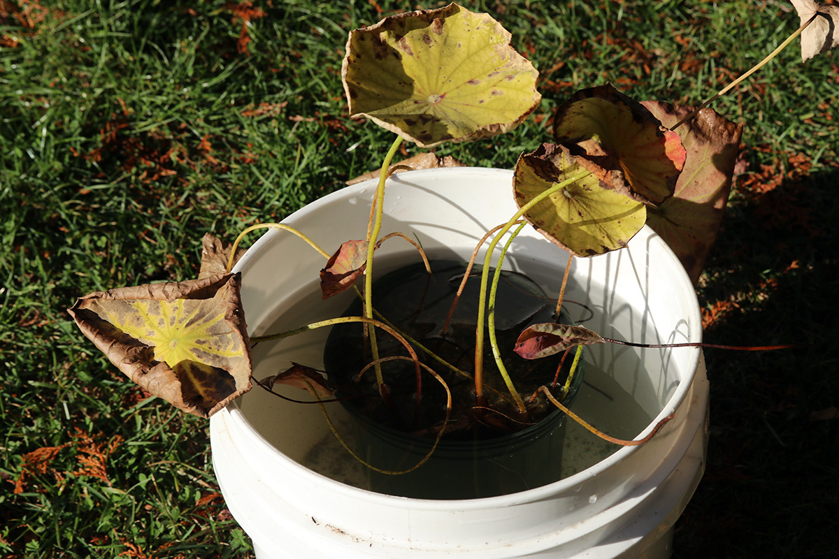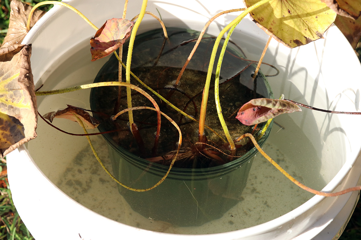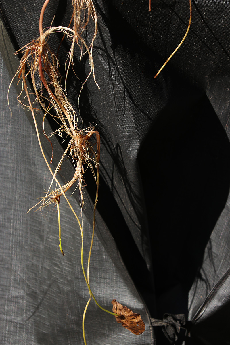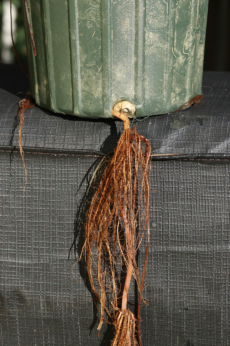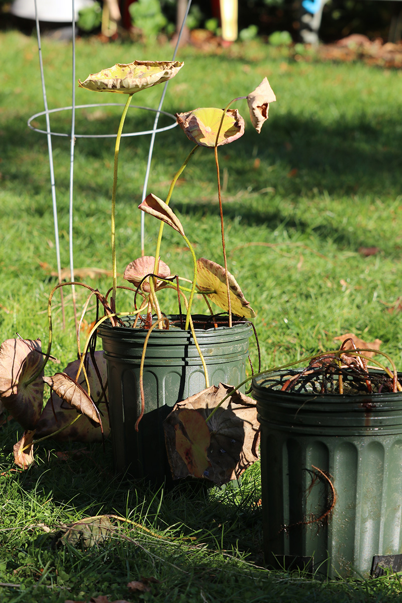 i've been dying to see what the roots of the lotus plants looked like. all summerlong i noticed roots had escaped from the individual pots and invaded the lotus barrel. what i discovered was surprising. only 2 lotus pots had escaped roots. one was about 2-1/2 ft long, the other was 5ft. it resembled a long fat root with long root nodes every 1/2 ft or so. the lotuses with the escaped roots were also the ones that seemed to succumb first to the cold temperature. the lotus with the longer root seemed to be healthier; the one with the shorter root, the root stem seemed to be kinked at the point where it escaped the pot and might be in danger of snapping off entirely.