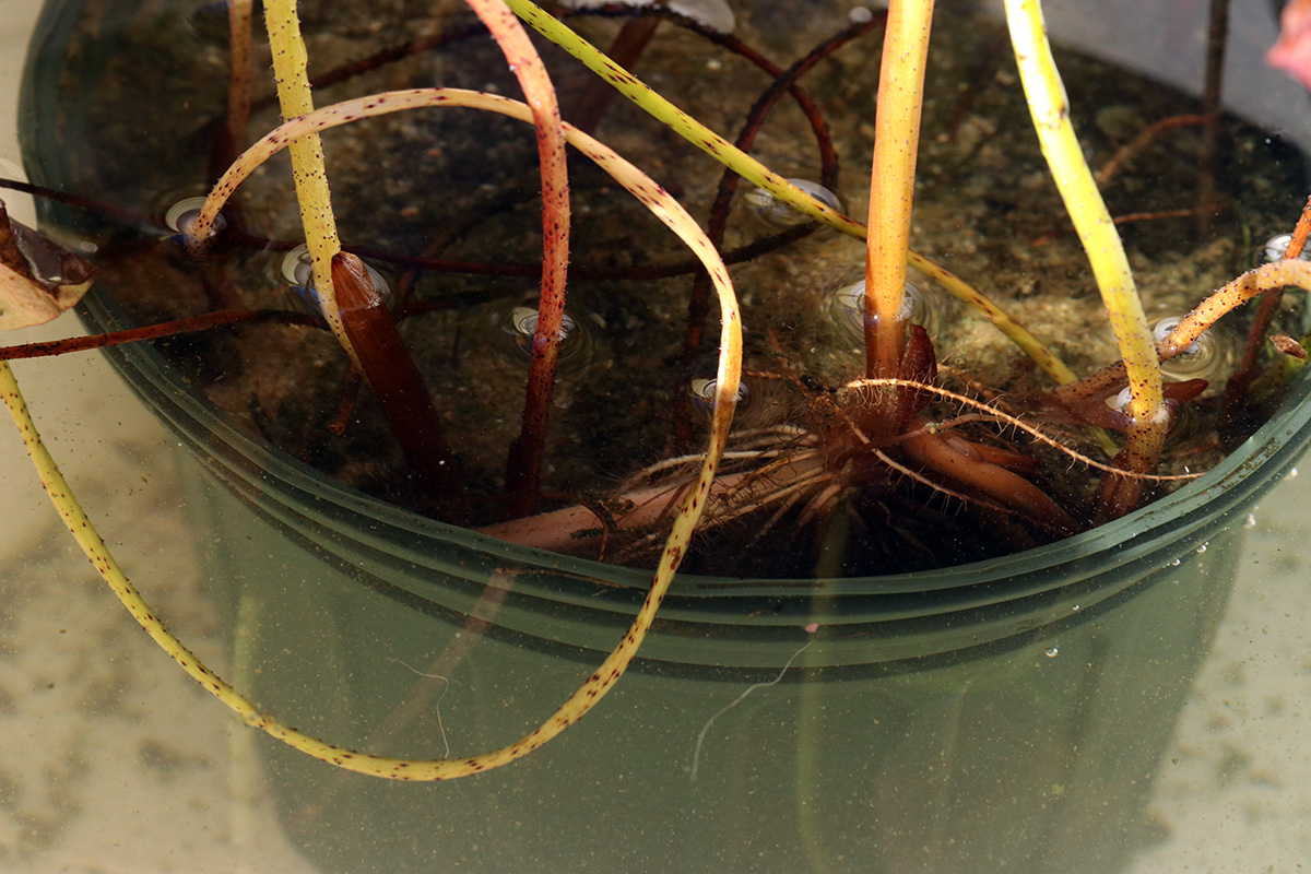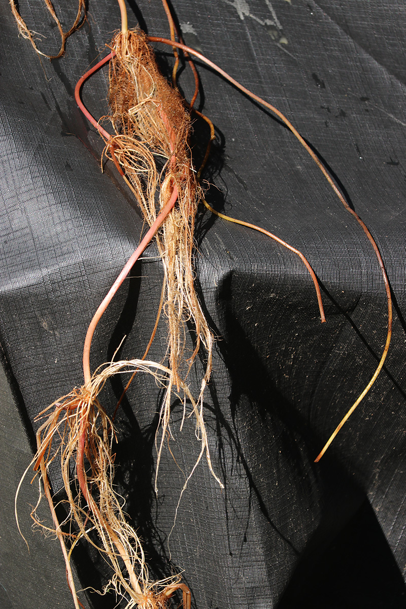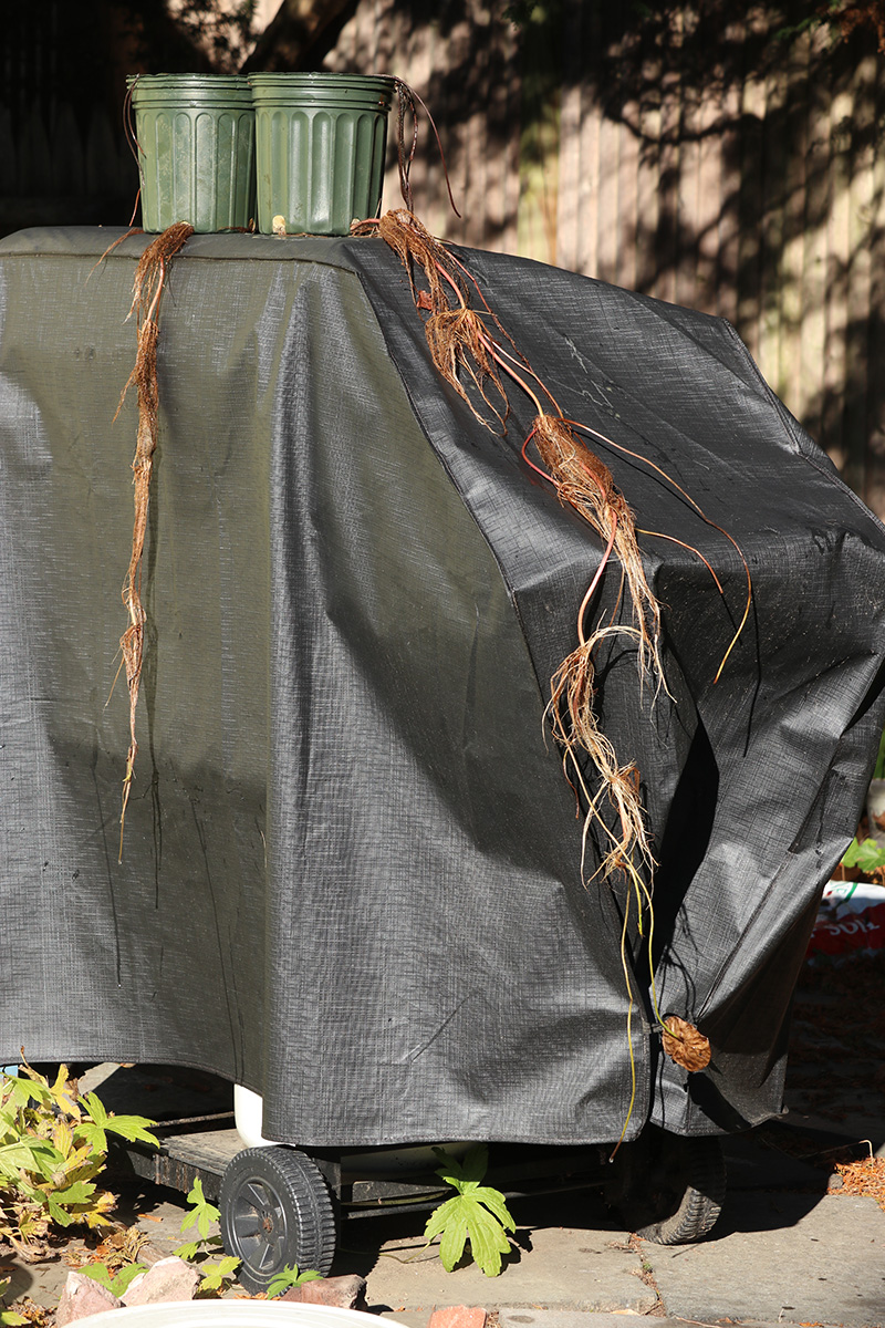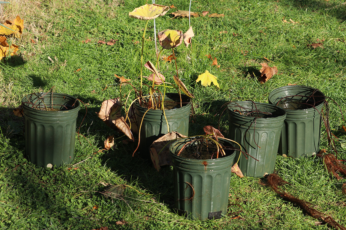 i've been dying to see what the roots of the lotus plants looked like. all summerlong i noticed roots had escaped from the individual pots and invaded the lotus barrel. what i discovered was surprising. only 2 lotus pots had escaped roots. one was about 2-1/2 ft long, the other was 5ft. it resembled a long fat root with long root nodes every 1/2 ft or so. the lotuses with the escaped roots were also the ones that seemed to succumb first to the cold temperature. the lotus with the longer root seemed to be healthier; the one with the shorter root, the root stem seemed to be kinked at the point where it escaped the pot and might be in danger of snapping off entirely.