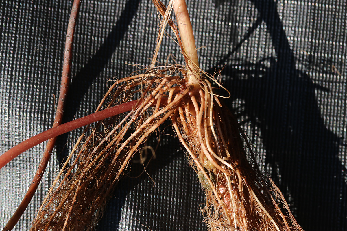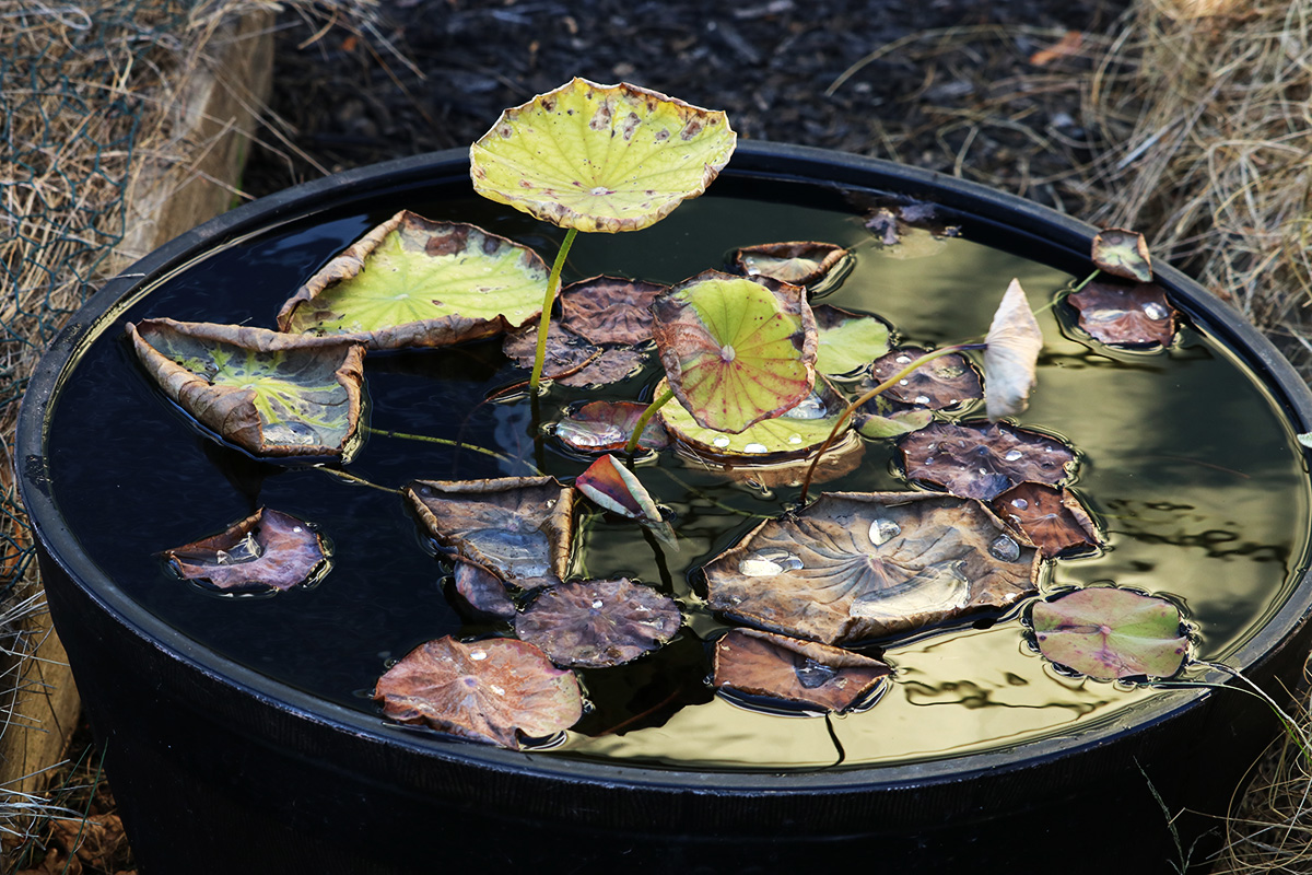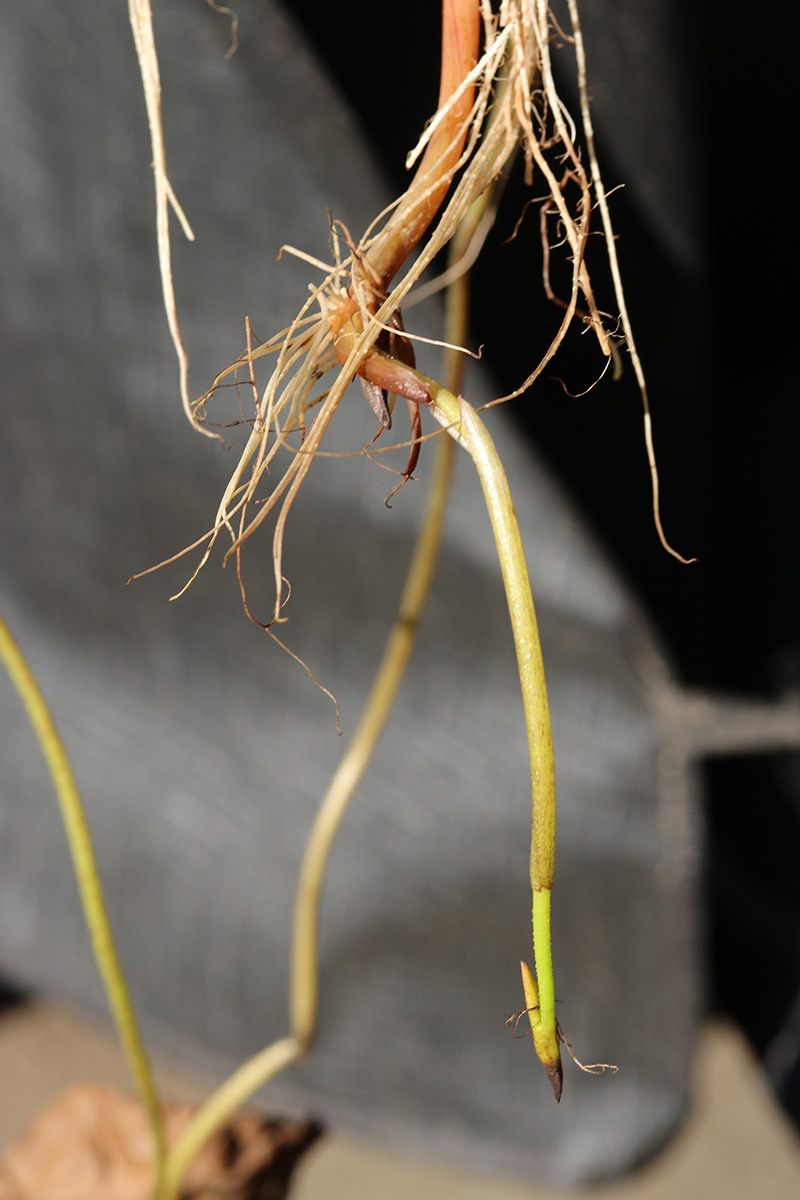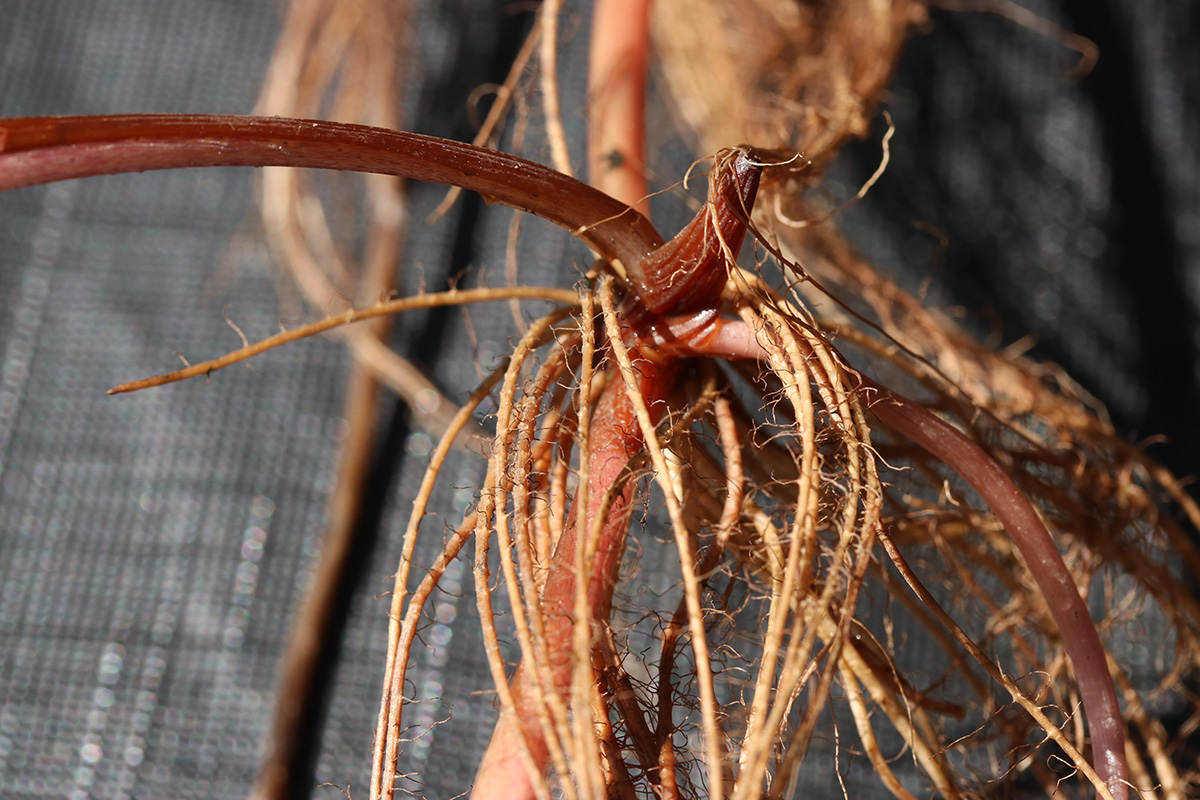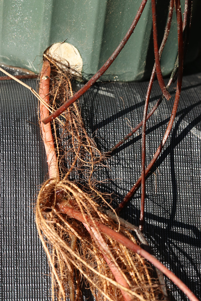 i've been dying to see what the roots of the lotus plants looked like. all summerlong i noticed roots had escaped from the individual pots and invaded the lotus barrel. what i discovered was surprising. only 2 lotus pots had escaped roots. one was about 2-1/2 ft long, the other was 5ft. it resembled a long fat root with long root nodes every 1/2 ft or so. the lotuses with the escaped roots were also the ones that seemed to succumb first to the cold temperature. the lotus with the longer root seemed to be healthier; the one with the shorter root, the root stem seemed to be kinked at the point where it escaped the pot and might be in danger of snapping off entirely.