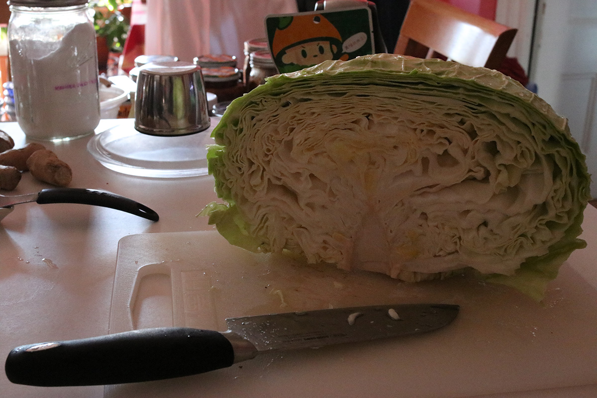 i started assembling the paocai by 6pm. chopping up all the ingredients look a long time, nearly an hour at my turtle speed (given my history with knives, i'm super cautious, i want to keep my fingers). since i was making two jars of paocai, i divided up the ingredients in half. i started with the radish/carrots/ginger. when i got to the cabbage, i discovered i couldn't just chop them up because they'd fall apart. i ended up packing the cabbage into the jar as soon as i cut them. unlike the napa cabbage for the kimchi - which had a simple uniform rectangular shape - trying to figure out where to cut the chinese cabbage was more challenging. i tried to get stacks of leaves, but they fell apart easily. by the end i sort of gave up, chopped the best i could, then stuffed the cabbage into the jar. i also layered, adding daikon/carrots/ginger/chili/peppercorns between the cabbages.