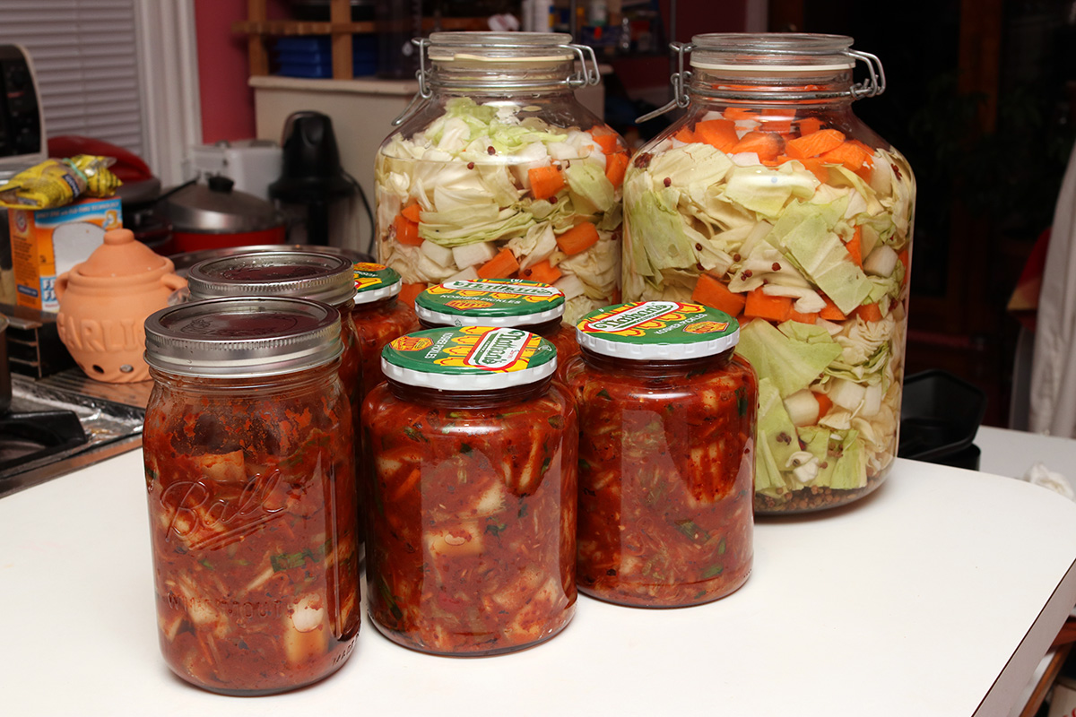 the good thing about sichuan paocai is it doesn't need refrigeration. left on the counter top, it will slowly ferment and grow increasingly stronger in flavor. besides 2 5L fido jars of paocai, i also have 6 quart jars of korean kimchi. if i make some german sauerkraut, i'll have a trifecta of fermented vegetables.