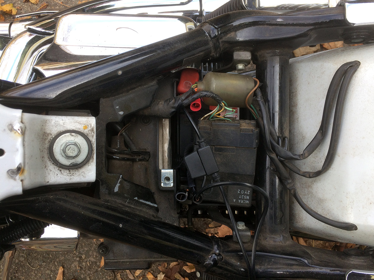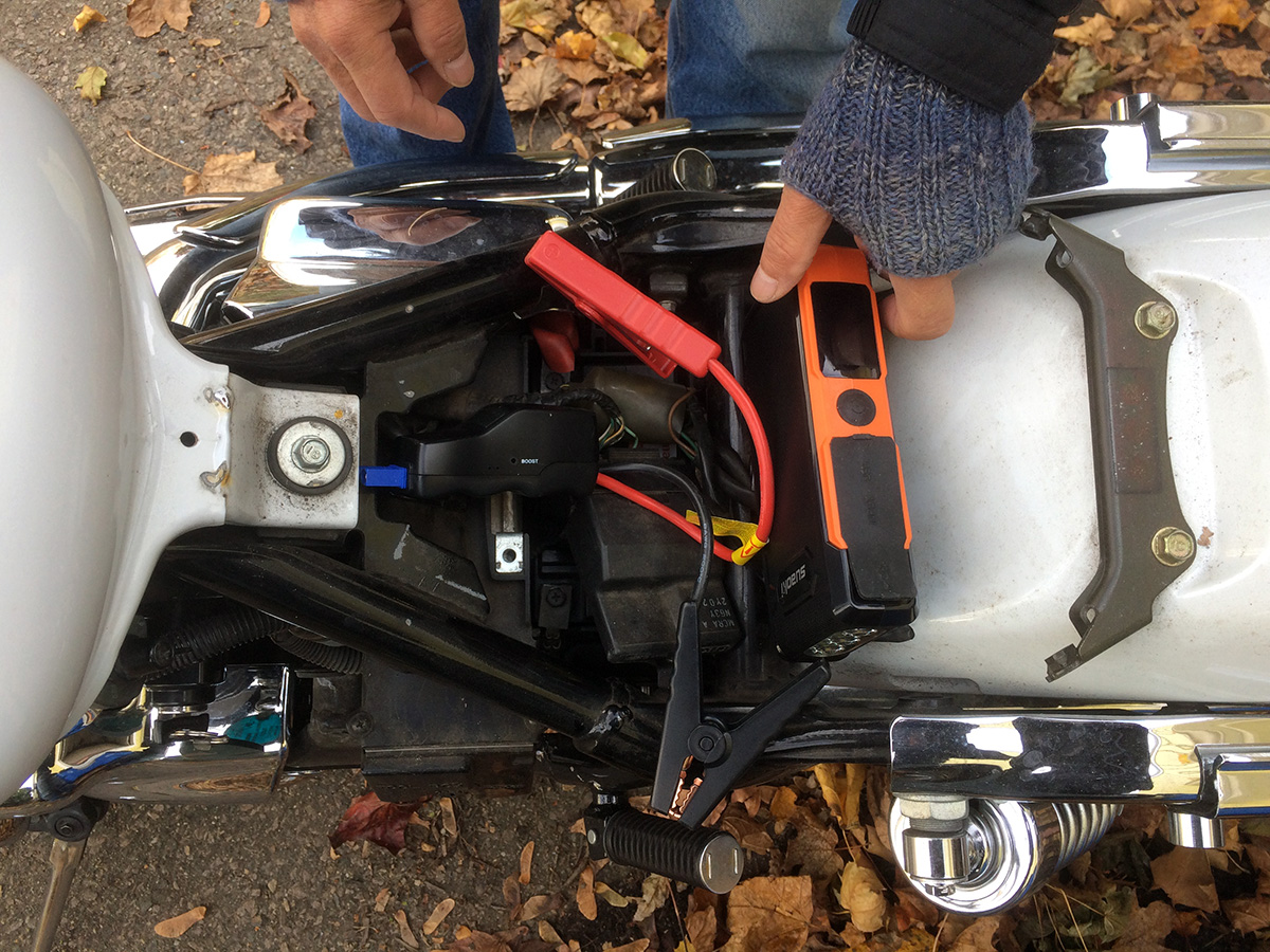 my father helped me push the bike out of the garage (so we could get access inside) so i could charge the battery out on the driveway. before i did that however, i thought it was the perfect opportunity to try my portable jump starter. i first had to disassemble the bike to get to the battery itself, which involves removing the bike seat and the plastic battery cover. then came the part of trying to attach the large jumper alligator clips to the relatively small battery terminals. having done that, i attached the cables to the battery pack. the led went green nearly instantly, meaning i could now start the engine. i clicked the starter button on the handlebar and the engine roared to life for the first time in 20 days.