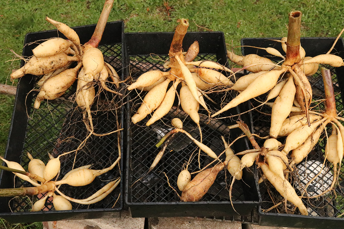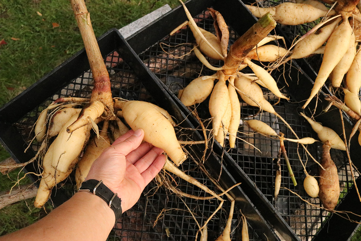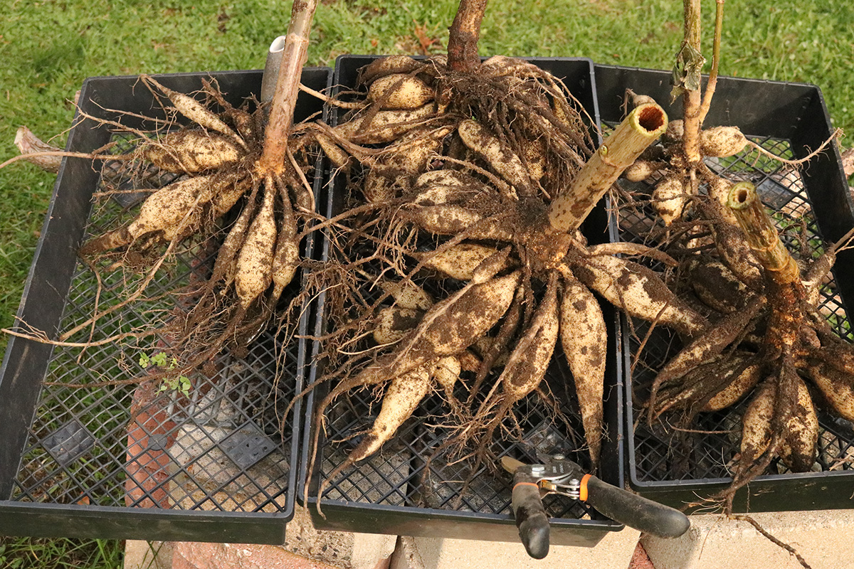 i dug up the dahlias. the weekend freeze had completely killed all the dahlia plants above ground, which is usually the time to dig up the tubers for next year's plants. tubers this season weren't as large as last season, but there were more of them. i rinsed them off with some rain water and left them to dry in the basement. after a few days (some suggest a few weeks) they should be ready for more long term storage.