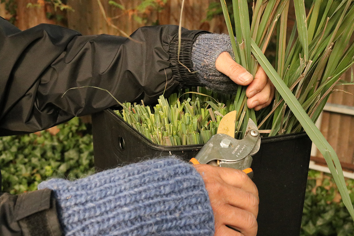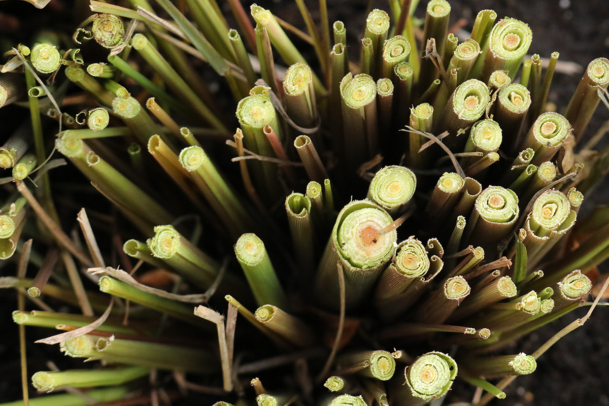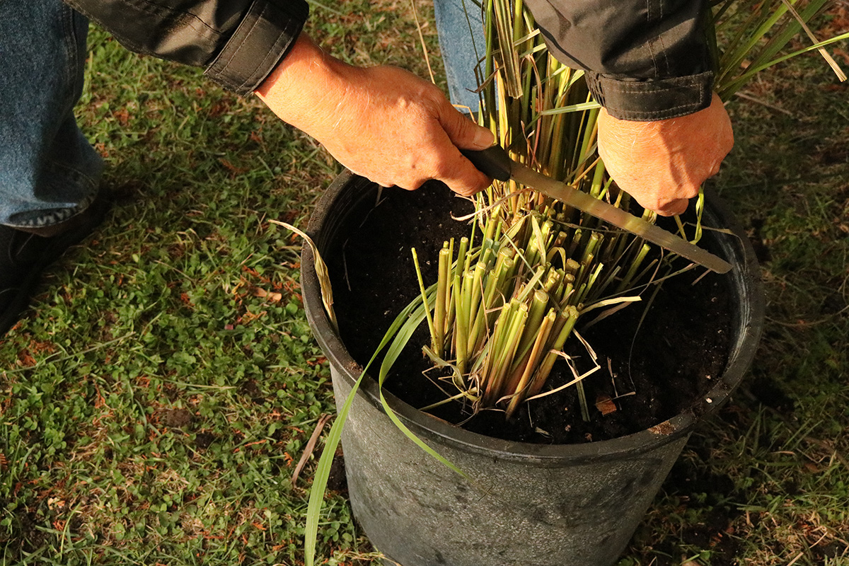 we prepped the lemon grass my father uprooted from my sister's backyard for winter storage. first he trimmed them back to a uniform height before removing them from the tall plastic container. they were two large clumps, but we decided to plant them into a single large pot for convenience. we filled the pot with the moisture control potting soil mix we bought from home depot yesterday before further trimming the lemon grass to about 5-6 inches tall. of the stalks we removed, we saved them for storage. i set the potted lemon grass into our basement grow room, which continues to expand in size.
