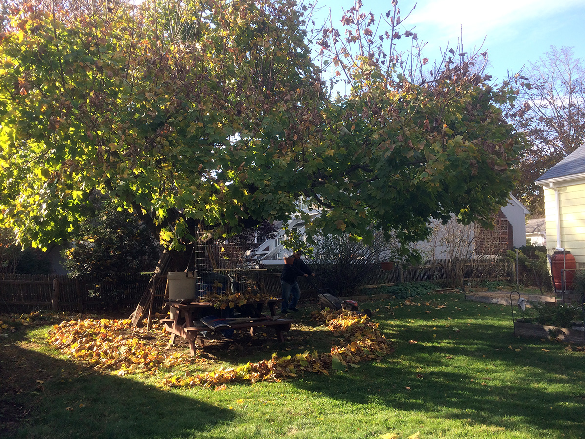 after lunch we were back outside. while my father mowed the lawn for the final time this year (saving the trimmings for our compost bin), i raked the leaves in the front lawn (those on the street we throw away because they're contaminated with road salt and sand). half of the backyard maple leaves have fallen, i raked them into a perimeter while my father went over the leaves with the mower. the combination of pulverized leaves and grass clippings will make for good compost.