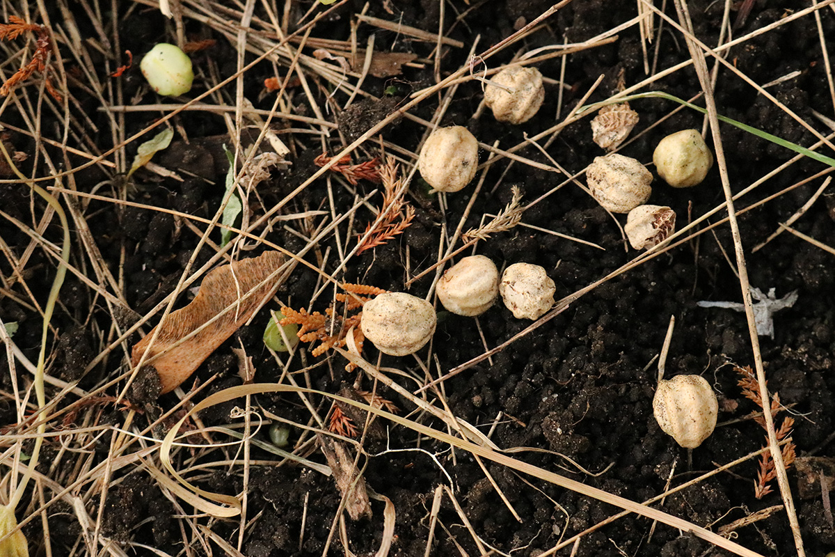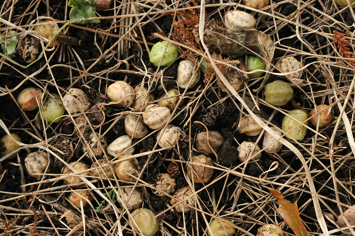 i uprooted all the dead nasturtiums and tossed them into the garden refuse bin. what i found in the dirt was nasturtium seeds in various stages of ripeness. a few were even beginning to sprout, but those will die come the next frost. my father asked me to sprinkle them throughout the other raised beds. i couldn't tell which ones were viable for long term storage indoors.