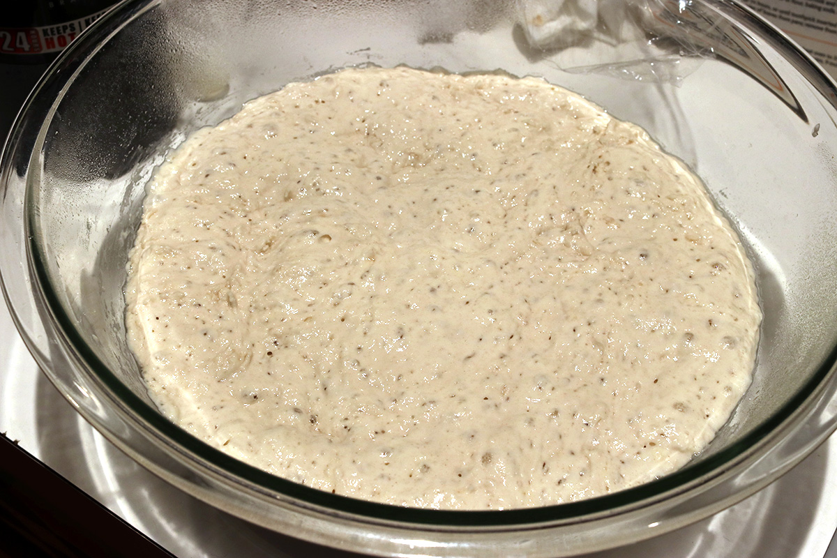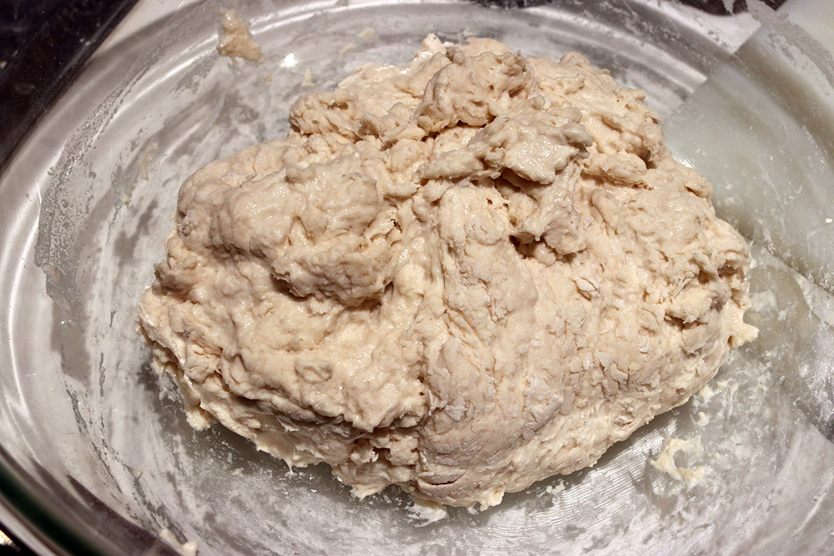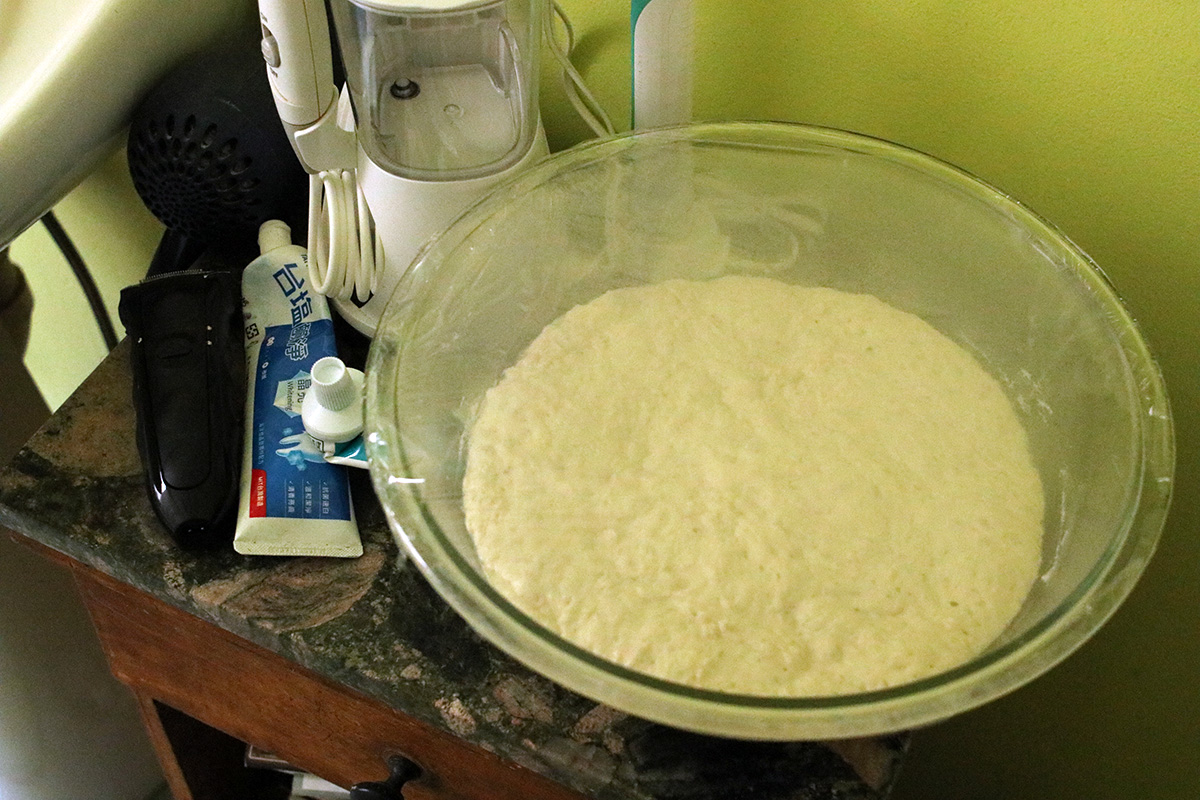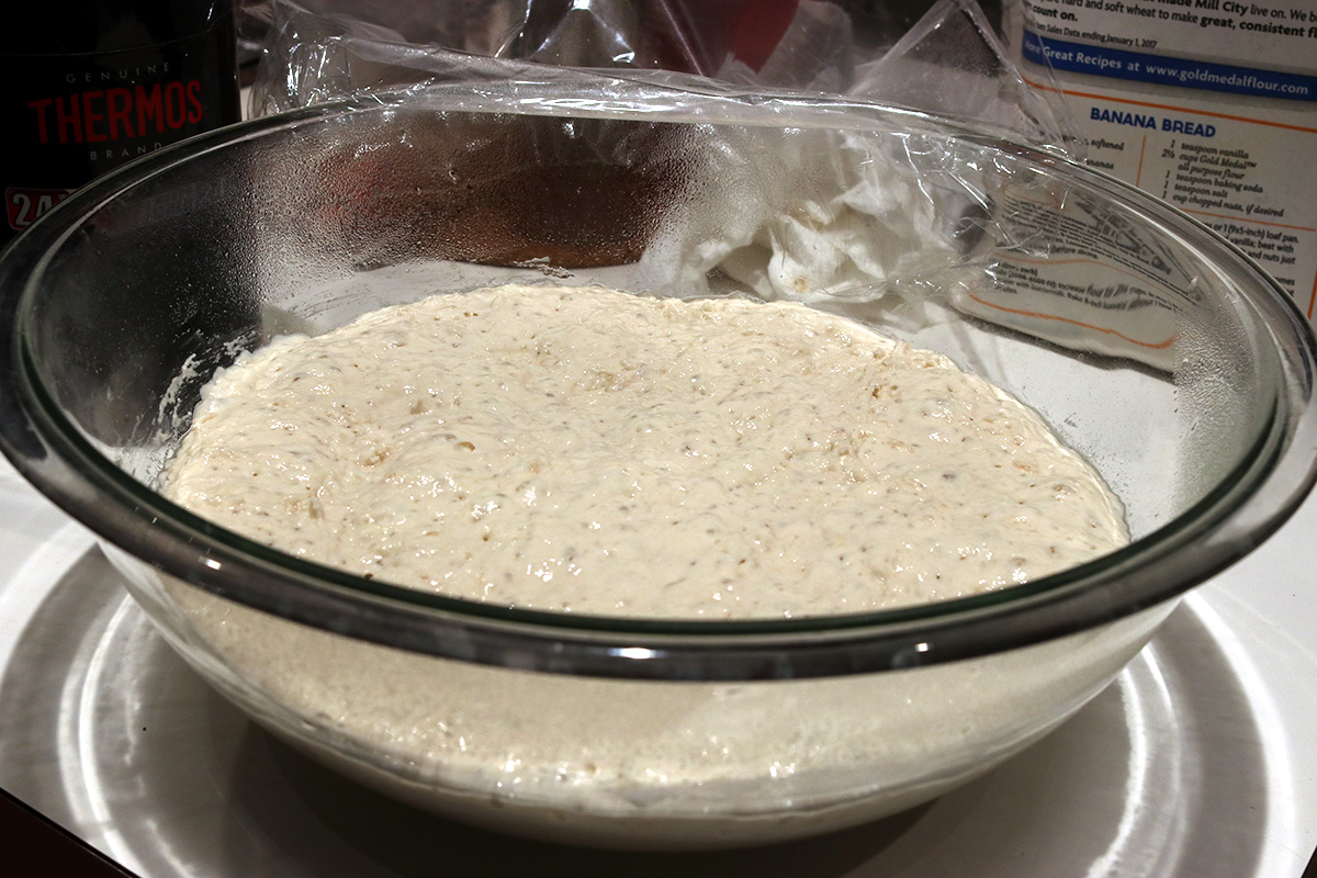 the weather turning cold was a good time to get back into bread making. i mixed a batch of no knead bread dough last night around midnight. i left it covered in my bathroom as it was the warmest place in the house. i left it to ferment overnight and throughout most of today. the bathroom smelled of fermenting yeast, not at all unpleasant, and a sign that my year old yeast was still viable. small holes formed all over the dough from escaping fermented gas. around 5pm, before i was about to leave for my 2nd harvard lecture of the day, i scooped the sticky dough out of the glass pyrex bowl onto a piece of parchment paper. it was so sticky, i couldn't get it to fold on itself to form a ball. so i did the best i could and left the dough as is, covered up and left to ferment a second time for 2 more hours, as per instructions. i then left for the lecture.