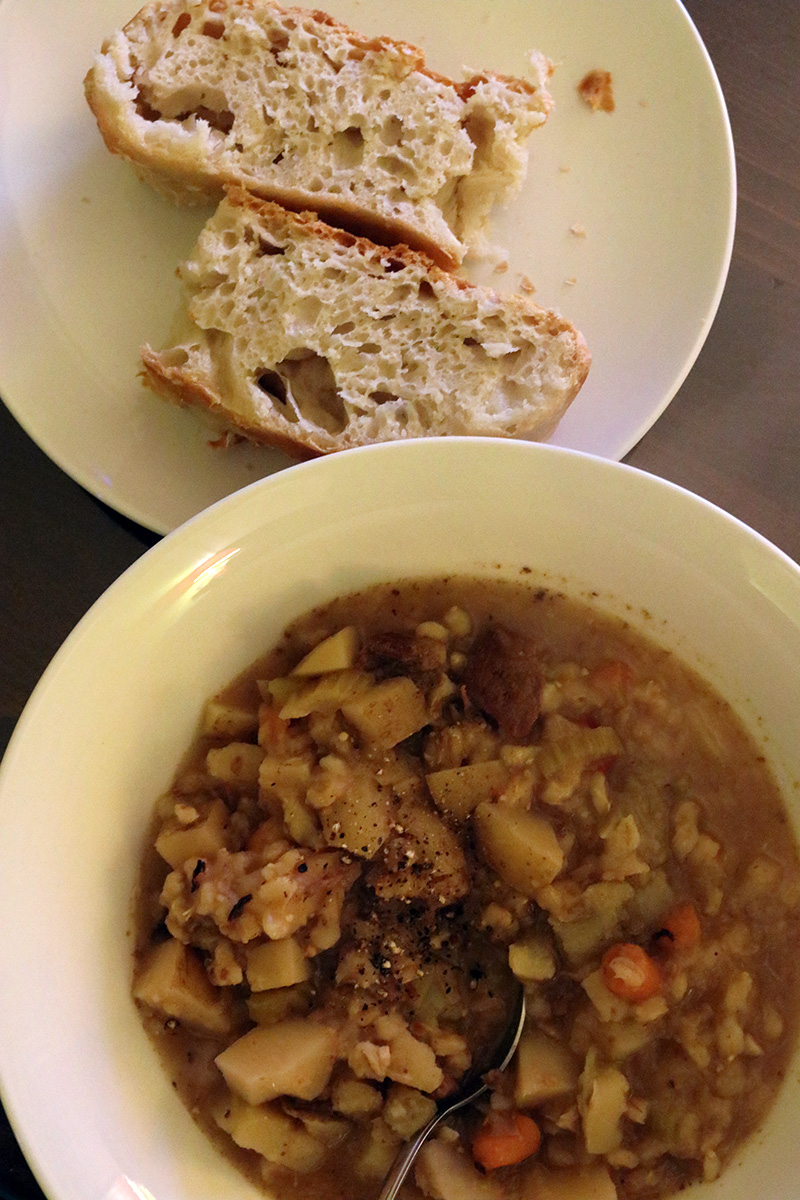 when the bread was finally done, i removed it from the dutch oven and ripped off the parchment paper that was partially stuck to the bread. although it looked flat, tastewise it wasn't bad, crispy on the outside, soft and chewy and moist on the inside. i ended up heating a bowl of leftover frozen beef barley stew because i felt it'd go great with the bread. good bread, bad stew.