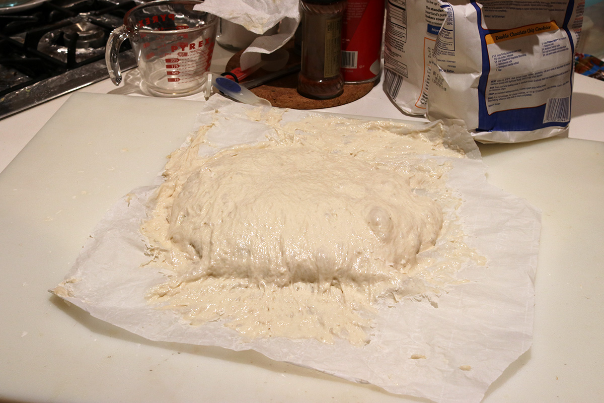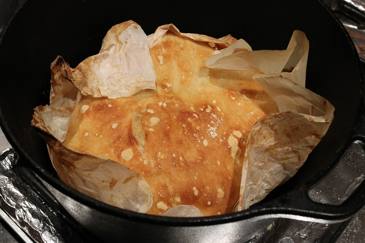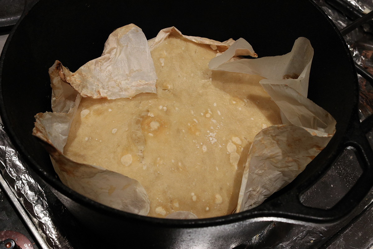back at home, it was time to bake the bread. the dough didn't seem to have risen very much, perhaps spread out more than actually rising. it was impossible to remove the dough from the parchment paper so i ended up just throwing the whole thing inside the preheated dutch oven. while that was happening, i mixed up a 2nd bread dough, this time measuring out the ingredients more carefully. the current bread seemed destined to fail, i was determined to try again and get it right. after the 30 minute mark when i removed the bread from the oven, it didn't look so bad. i put it back into the oven for another 20 minutes to brown the surface.