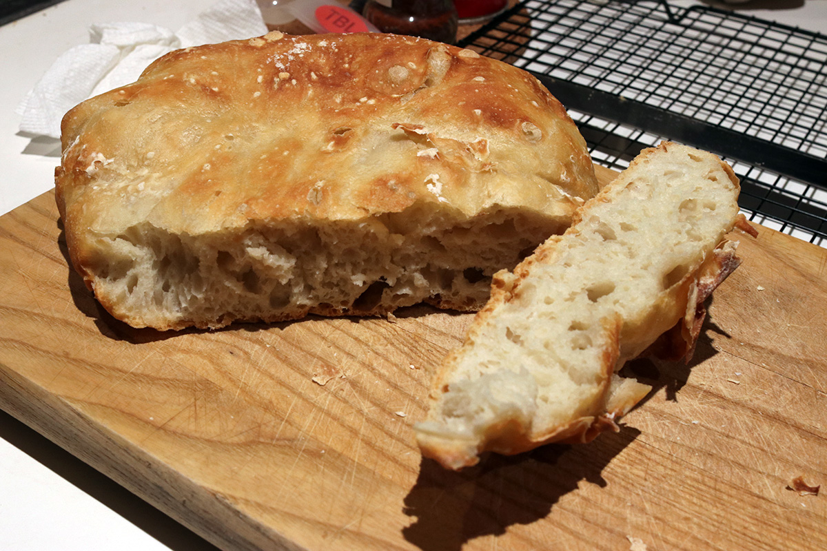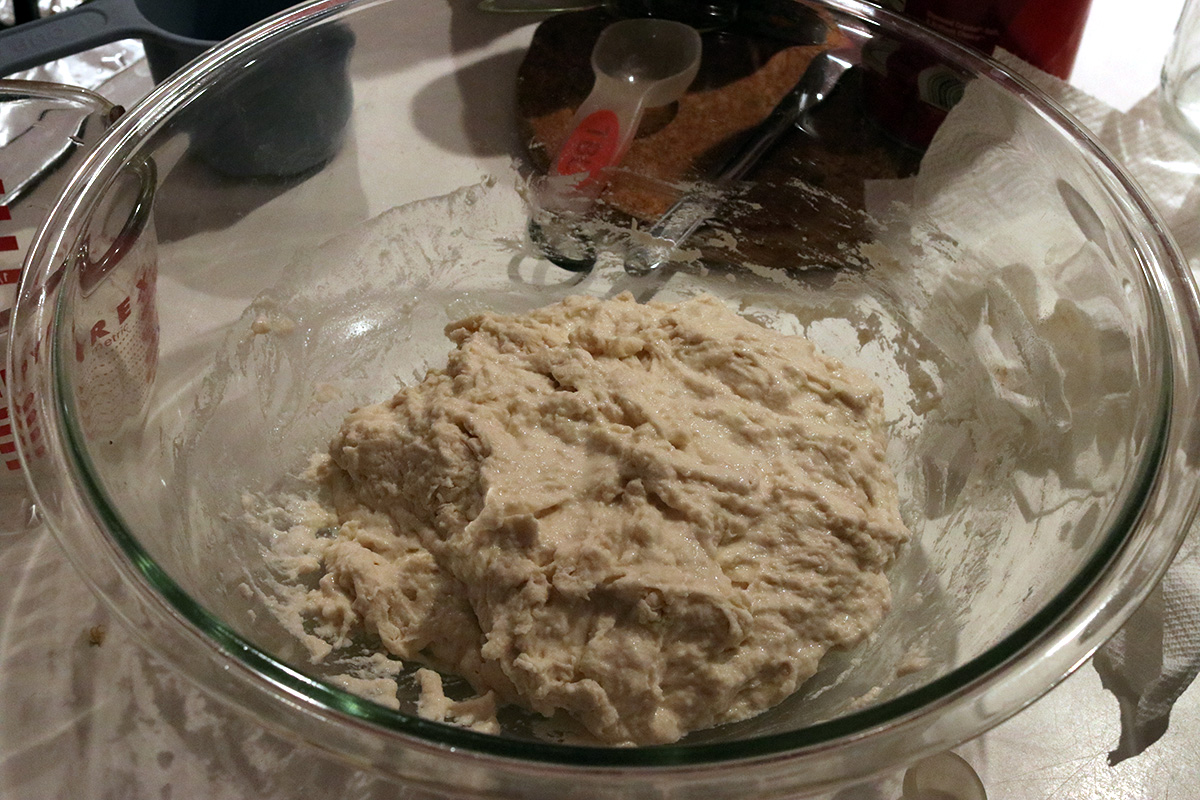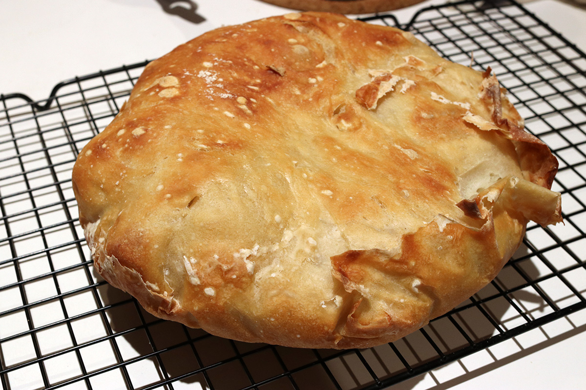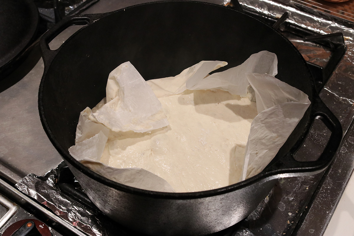 back at home, it was time to bake the bread. the dough didn't seem to have risen very much, perhaps spread out more than actually rising. it was impossible to remove the dough from the parchment paper so i ended up just throwing the whole thing inside the preheated dutch oven. while that was happening, i mixed up a 2nd bread dough, this time measuring out the ingredients more carefully. the current bread seemed destined to fail, i was determined to try again and get it right. after the 30 minute mark when i removed the bread from the oven, it didn't look so bad. i put it back into the oven for another 20 minutes to brown the surface.