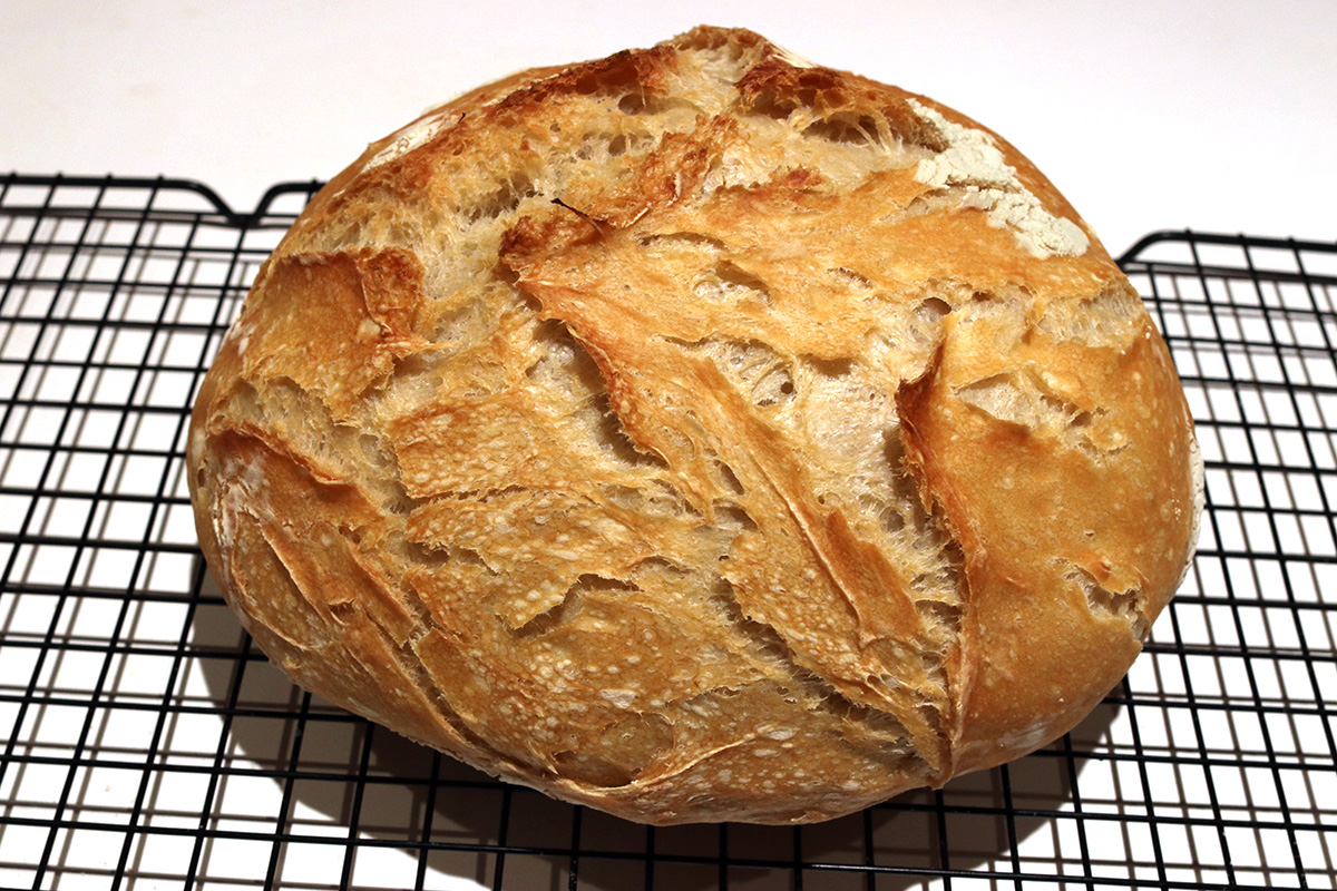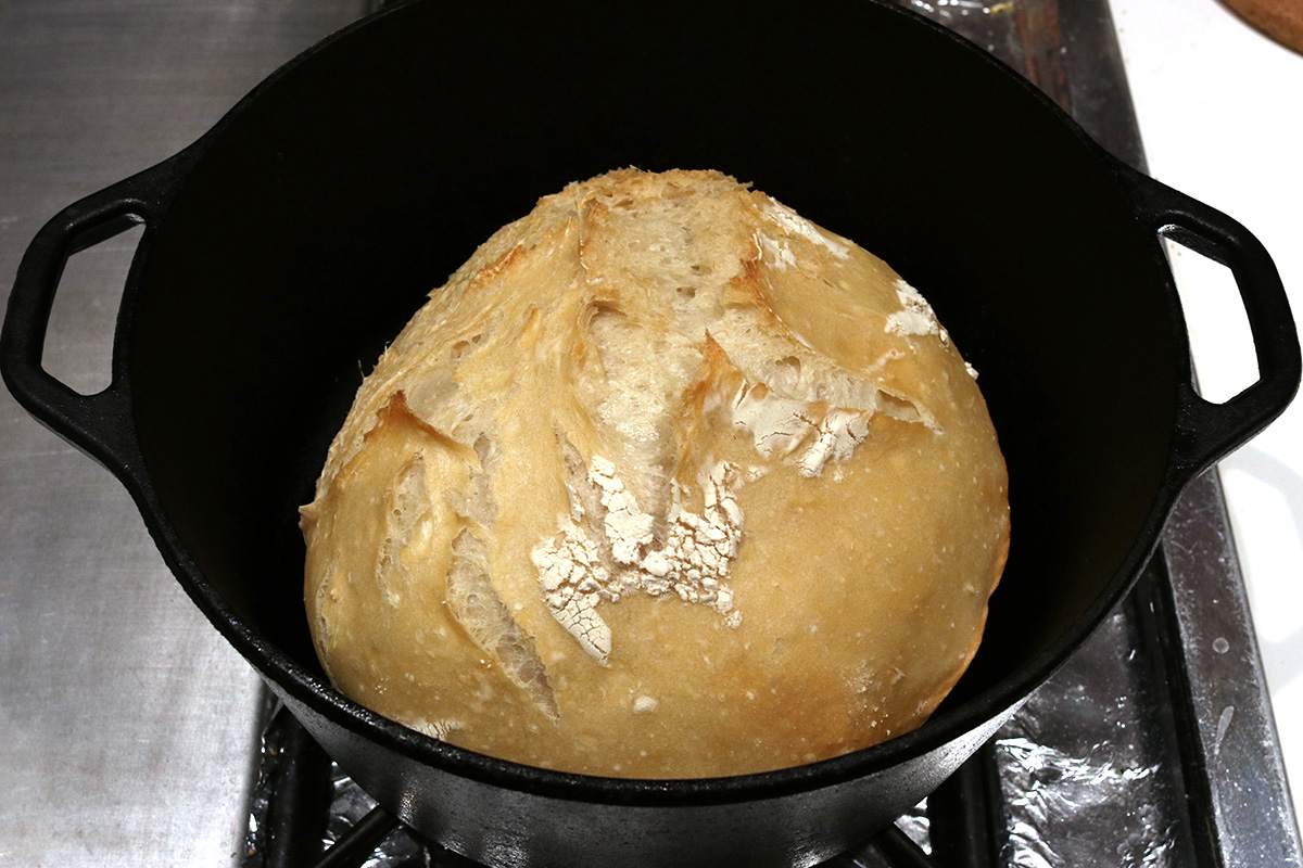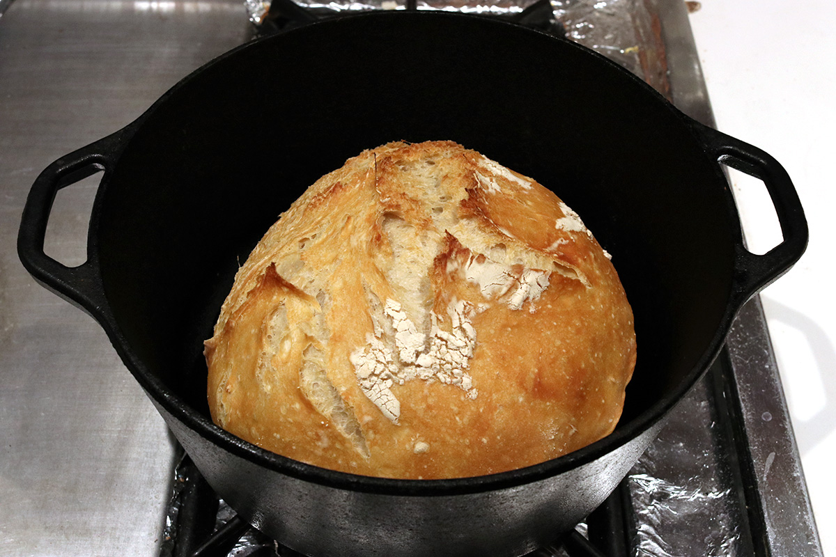 | mix bread ingredients in bowl then cover in plastic wrap and place somewhere warm for 18-20 hours. scrape sticky dough onto floured surface. with flour-coated hands, pull corners of dough into center, forming a tight ball. put seam side down on flour-covered parchment paper then place back into bowl for 2nd rise. cover with plastic wrap to prevent drying, let rise for 2 hours. 30 minutes beforehand, put dutch oven (cover on) into oven at 450°F. plop risen dough from parchment paper into dutch oven, seam side up. bake 30 minutes covered. bake 15-20 minutes uncovered for browning. | |