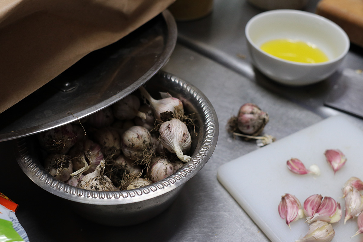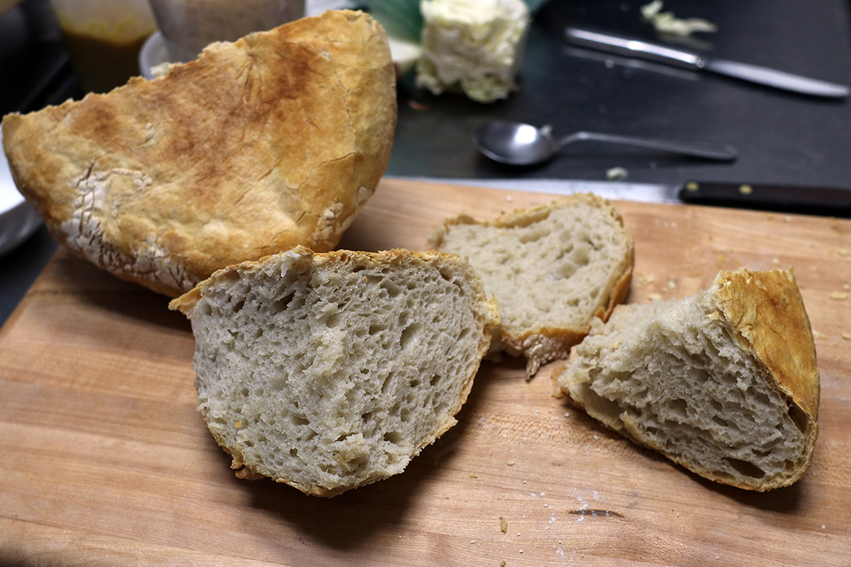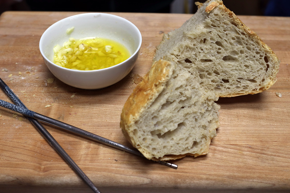 my 2nd aunt was there as well, as we made quick work of half the loaf, using an olive oil-garlic-salt dipping sauce. sliced open, it was still warm and soft on the inside.