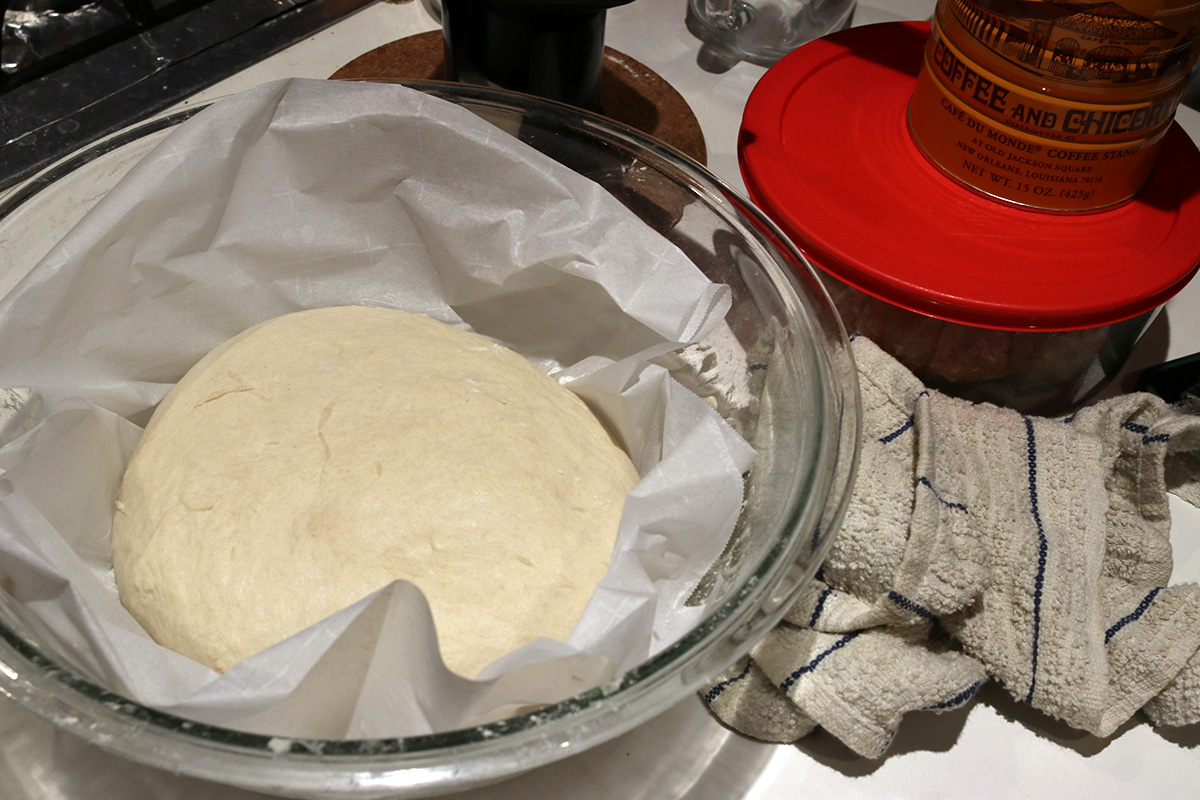 by the early afternoon today, when i was about to take out the dough and form it into a ball for the 2nd rise, the dough had grown so much in the bowl that i was afraid it might touch the plastic wrap cover. i still couldn't quite figure out how to form the dough. it wasn't as sticky and wet as yesterday, but it was still sticky. after reading some techniques online, i finally figured out a solution. first i scooped out the dough onto a large floured cutting board. that prevented it from sticking. then with flour-coated hands, i pulled up the sides of the dough so it formed into a ball. i then placed this dough ball onto a floured parchment paper (taking the place of a floured towel), and put the dough back into the bowl for the 2nd rise. i covered it up with plastic wrap and placed it back into the warm bathroom. in hindsight, i could've done away with the parchment paper, instead just flour the bowl so the dough doesn't stick to it.
