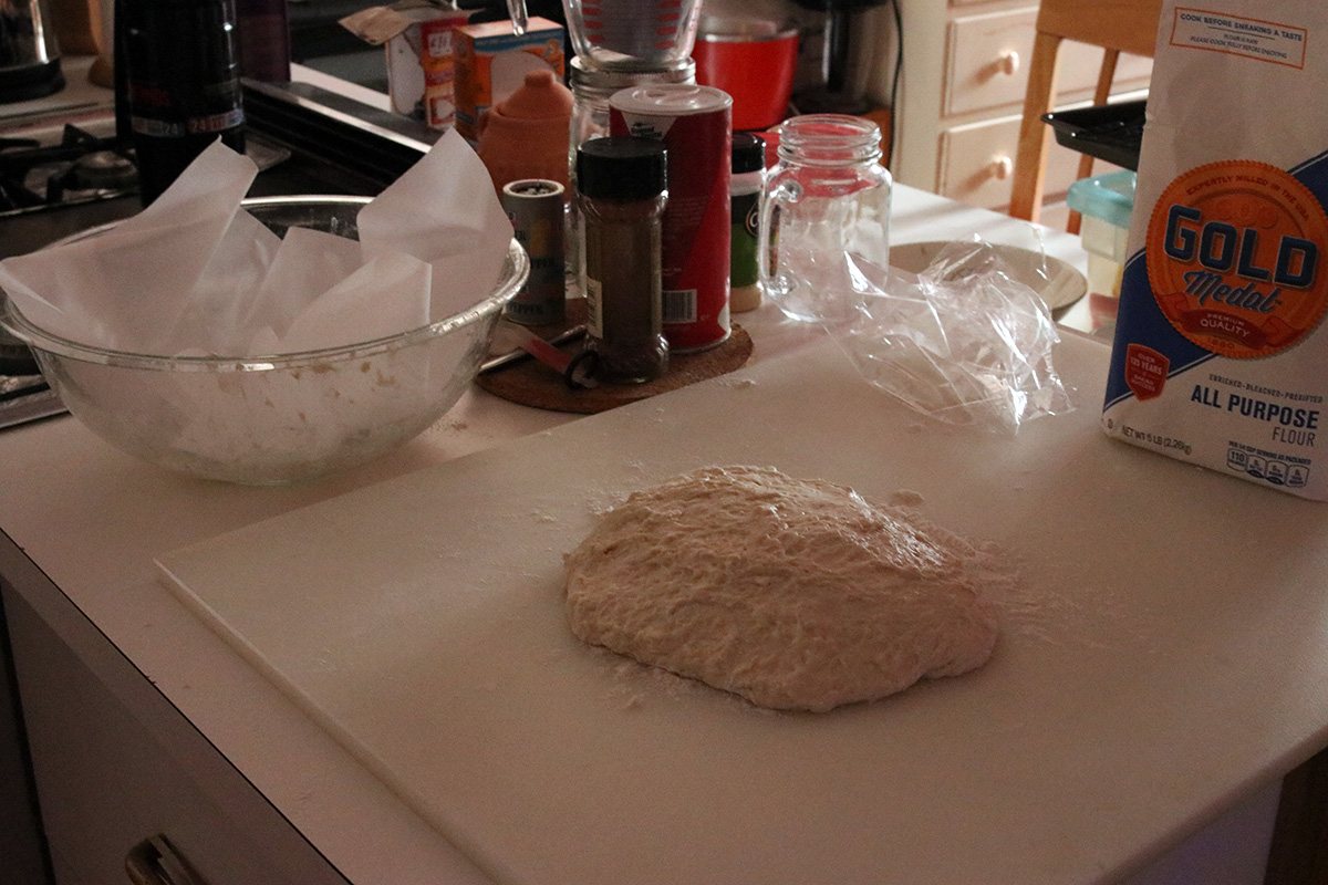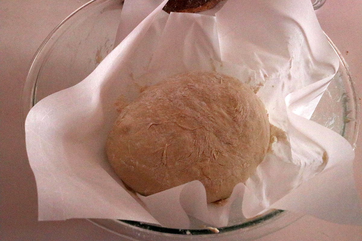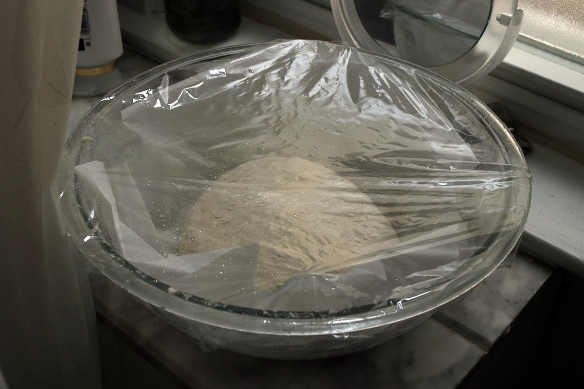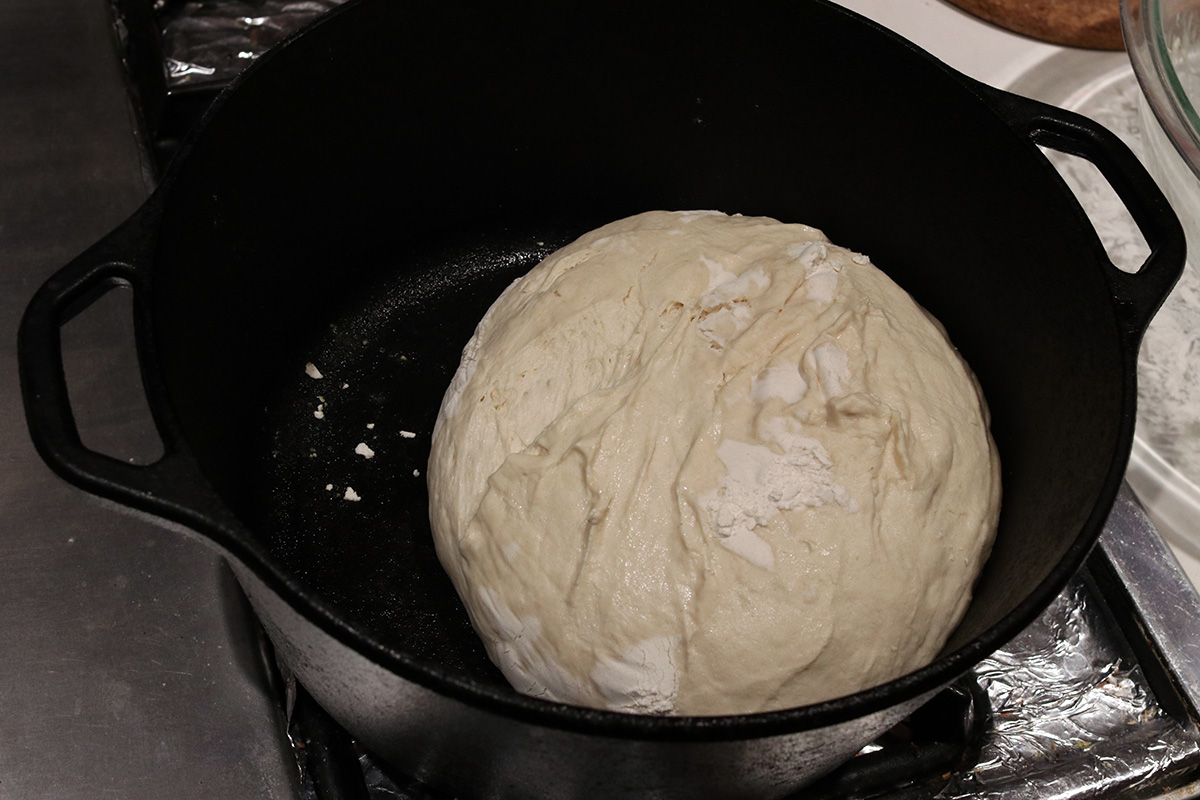 mixing bowl covered cast iron dutch oven plastic wrap parchment paper additional flour (dusting) |