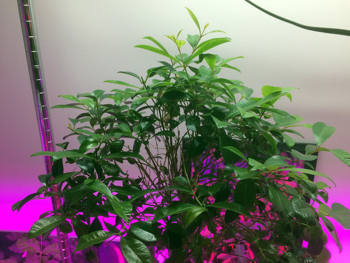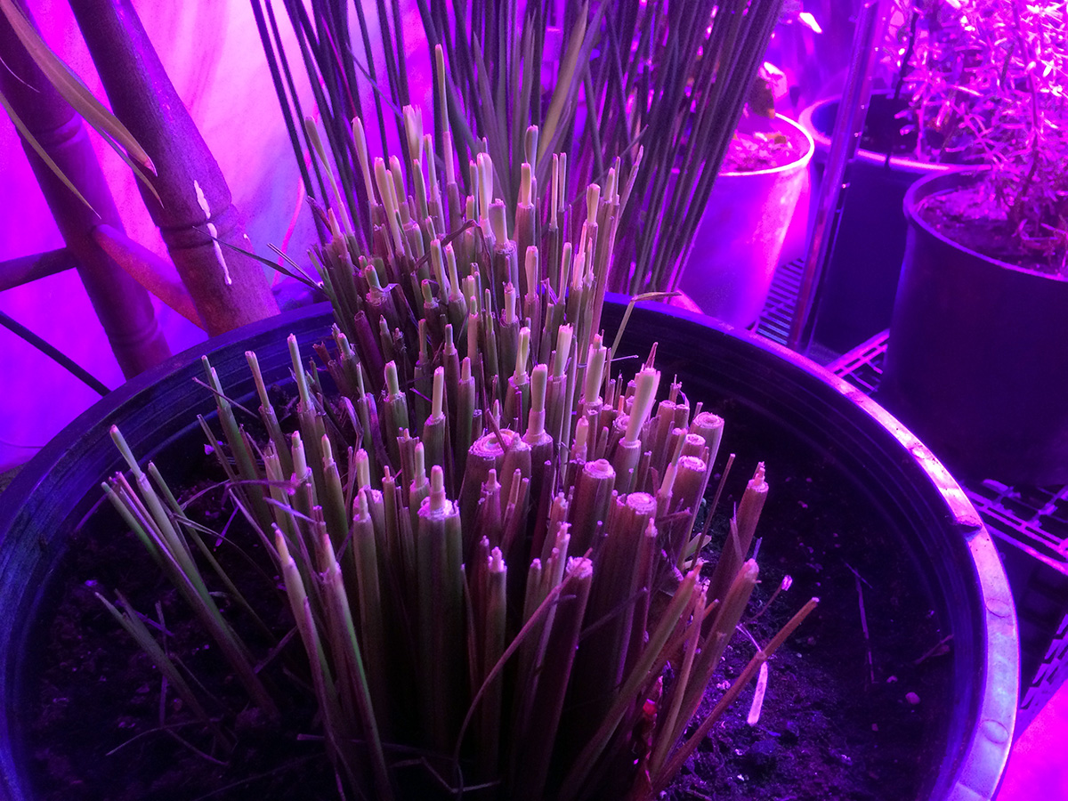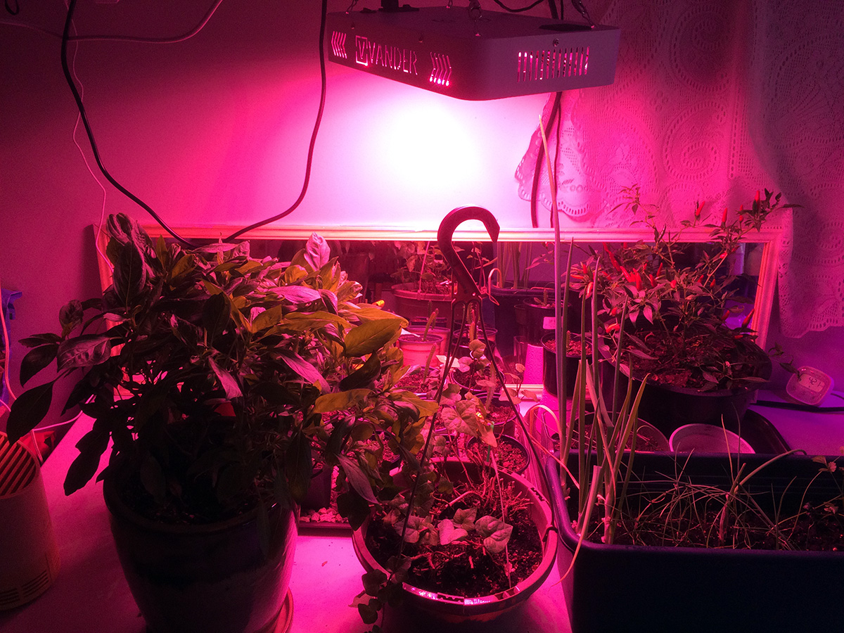 it's hard to tell under the magenta glare of the grow lights if the plants in the basement grow room are thriving or just surviving. my father has spent more time downstairs and if you ask him he'd tell you the plants are definitely thriving. at the very least they're not dying. we'd already tossed out one of the ficus topiaries over the weekend because it'd died, but the other one seems to be doing well growing under a canopy of white led lights as well as red/blue grow lights. what surprised me is seeing the lemon grass growing; i figured they'd stay dormant during the winter.