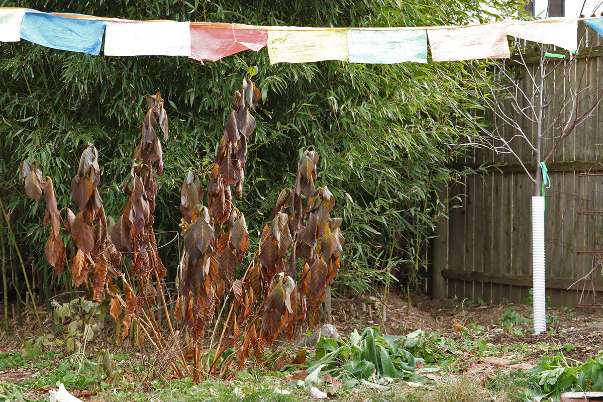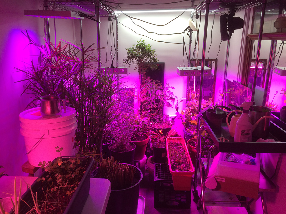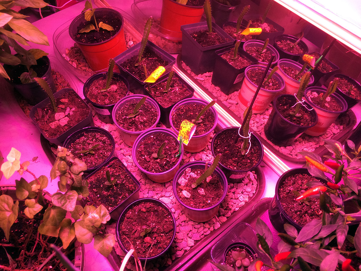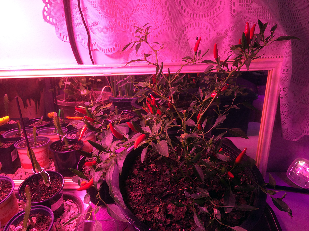 it's hard to tell under the magenta glare of the grow lights if the plants in the basement grow room are thriving or just surviving. my father has spent more time downstairs and if you ask him he'd tell you the plants are definitely thriving. at the very least they're not dying. we'd already tossed out one of the ficus topiaries over the weekend because it'd died, but the other one seems to be doing well growing under a canopy of white led lights as well as red/blue grow lights. what surprised me is seeing the lemon grass growing; i figured they'd stay dormant during the winter.