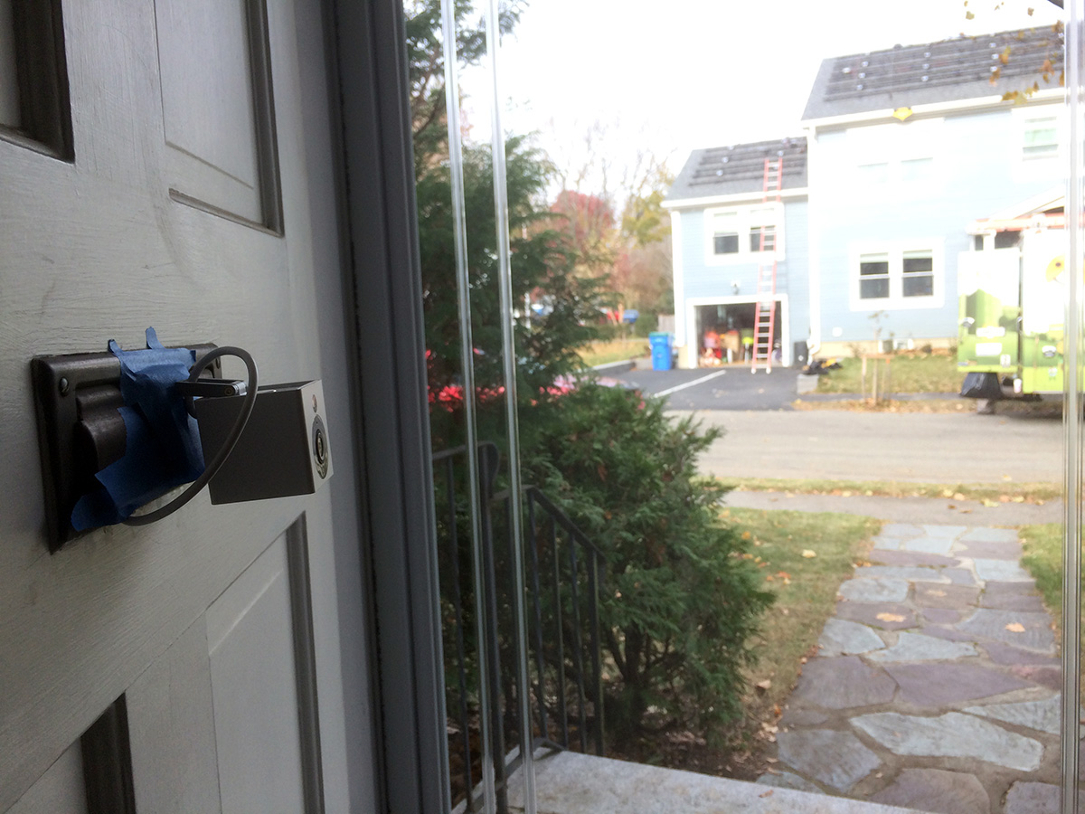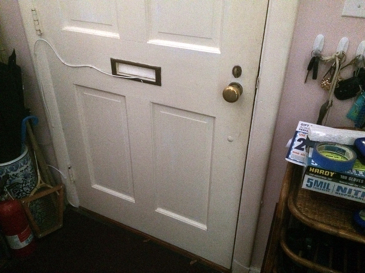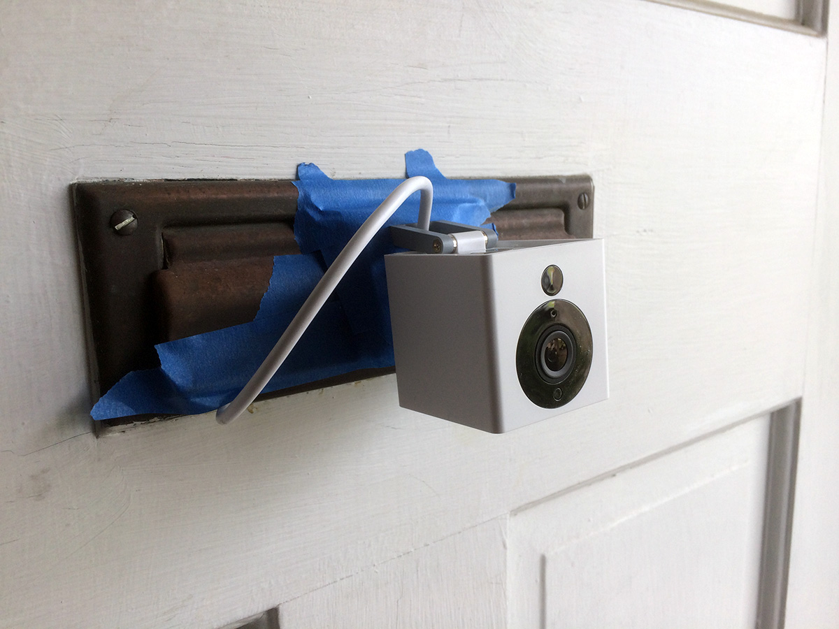 i relocated the front door wyzecam by taping it to the unused mail slot with blue tape. it looked conspicuous, but this was just temporary, so i could get some footage. the power cord i snaked underneath the floor mat and taped it across the back of the door, poking out of the mail slot. i figured they weren't going to install the panels today because i didn't see any panel deliveries and those usually are done in the early morning.