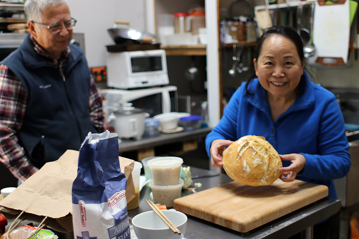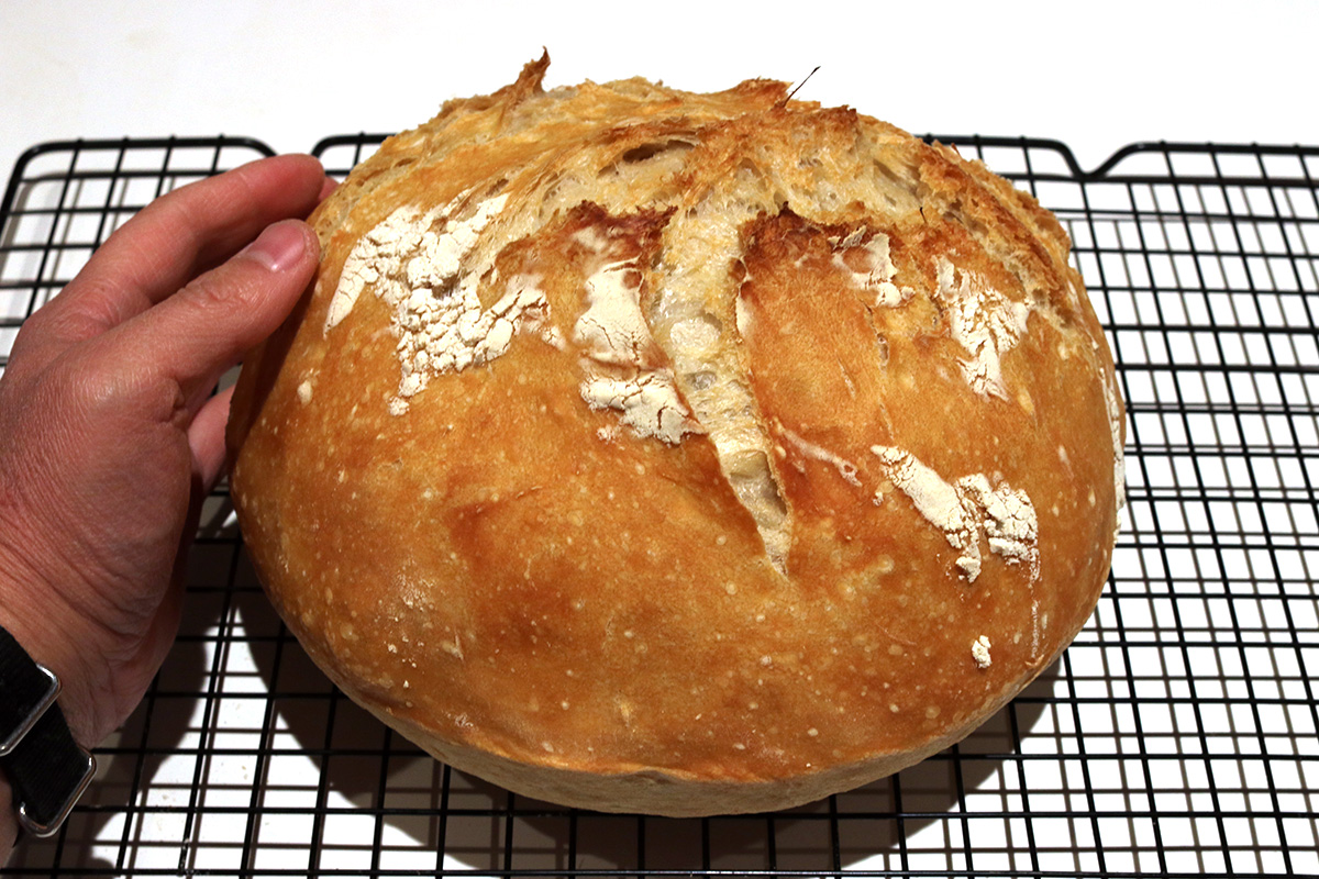 30 minutes later i took it out of the oven. taking off the cover revealed a beautiful round puffy bread ball. i baked it for 15 more minutes uncovered. during that time i got dressed so i could leave as soon as the bread finished baking. taking it out of the dutch oven and letting it rest on a cooling rack, i could hear the bread crackling. i put the bread inside of a paper bag and put the paper bag inside of an insulated tote before bicycling to the cafe to present my no knead bread.