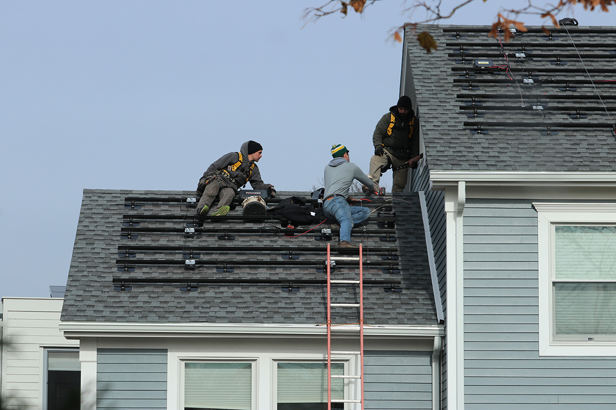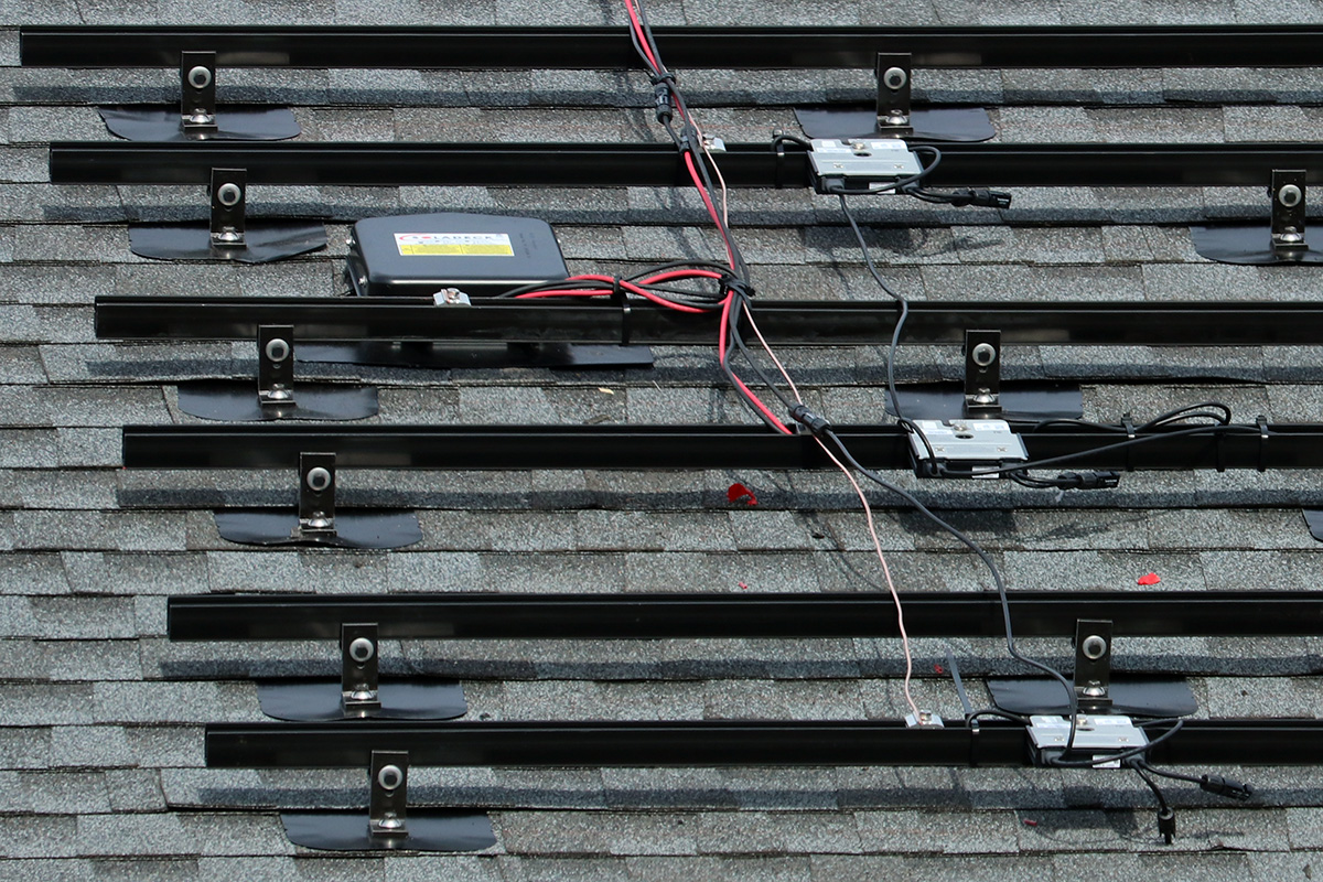 i was afraid i'd missed the panel installation, but they hadn't even started yet, still doing the wiring on the racks above the garage. from the bedroom window i observed them working through my telephoto lens. my father had figured out that each of the silvery nodes was were the solar panels would be placed. based on the number of nodes, there was going to be 28 panels on the main roof while 6 more panels above the garage. no panels on the roof above the guest bedroom, primarily because a sidewalk silver maple tree grows right in front of it blocking the sun. from telephoto closeups i could tell these nodes were actually solaredge optimizers (instead of enphase microinverters). i also saw a box with a "soladeck" label which i learned is a rooftop pass-through enclosure, which meant the conduit to the actual inverter itself was inside the house (most likely through the attic space) instead of outside (like it typically is).