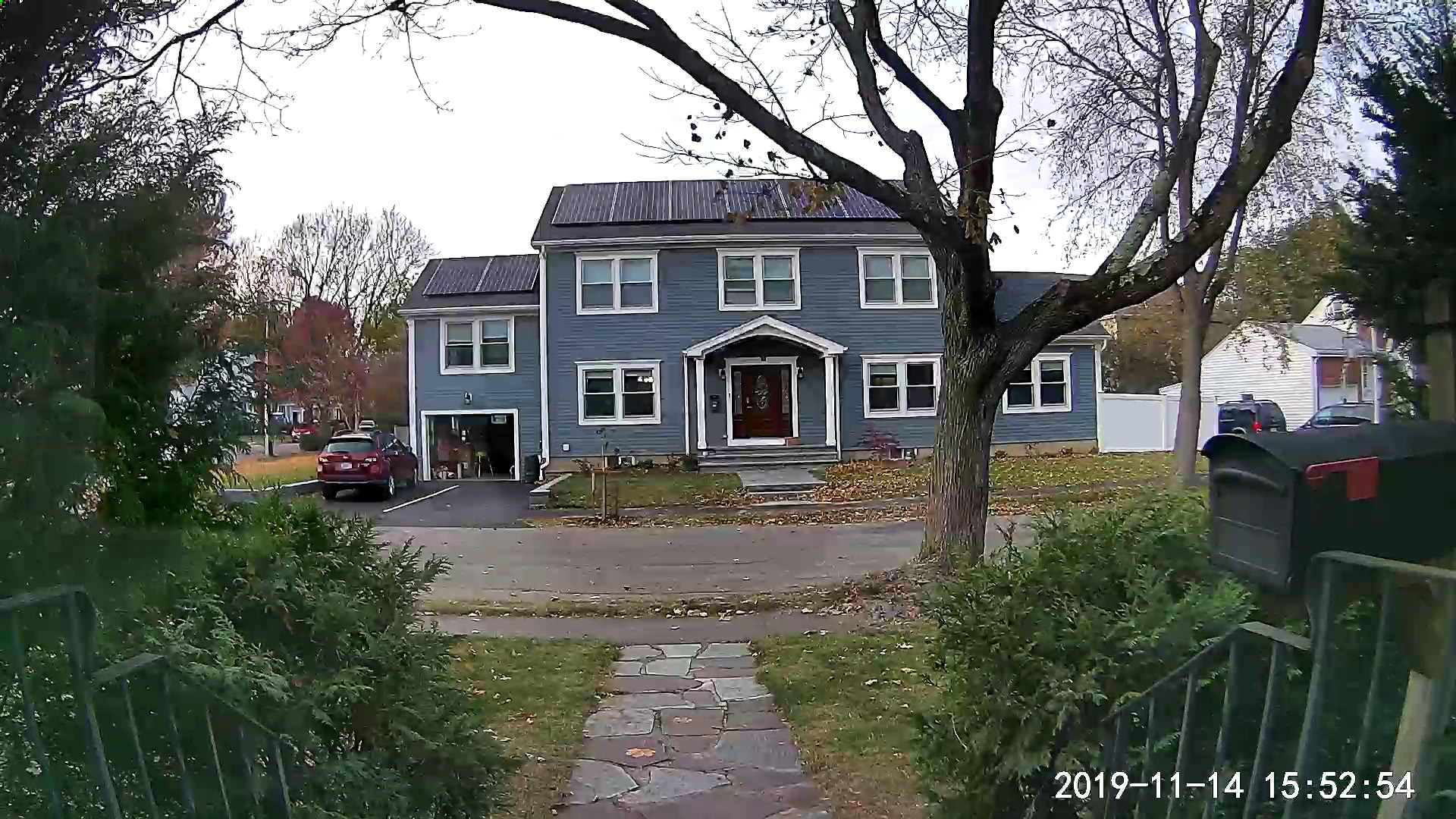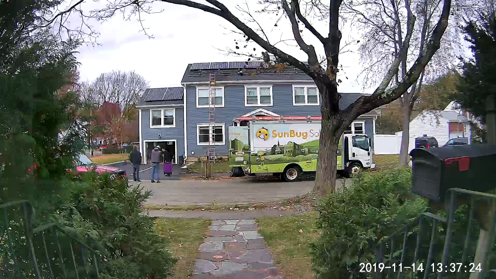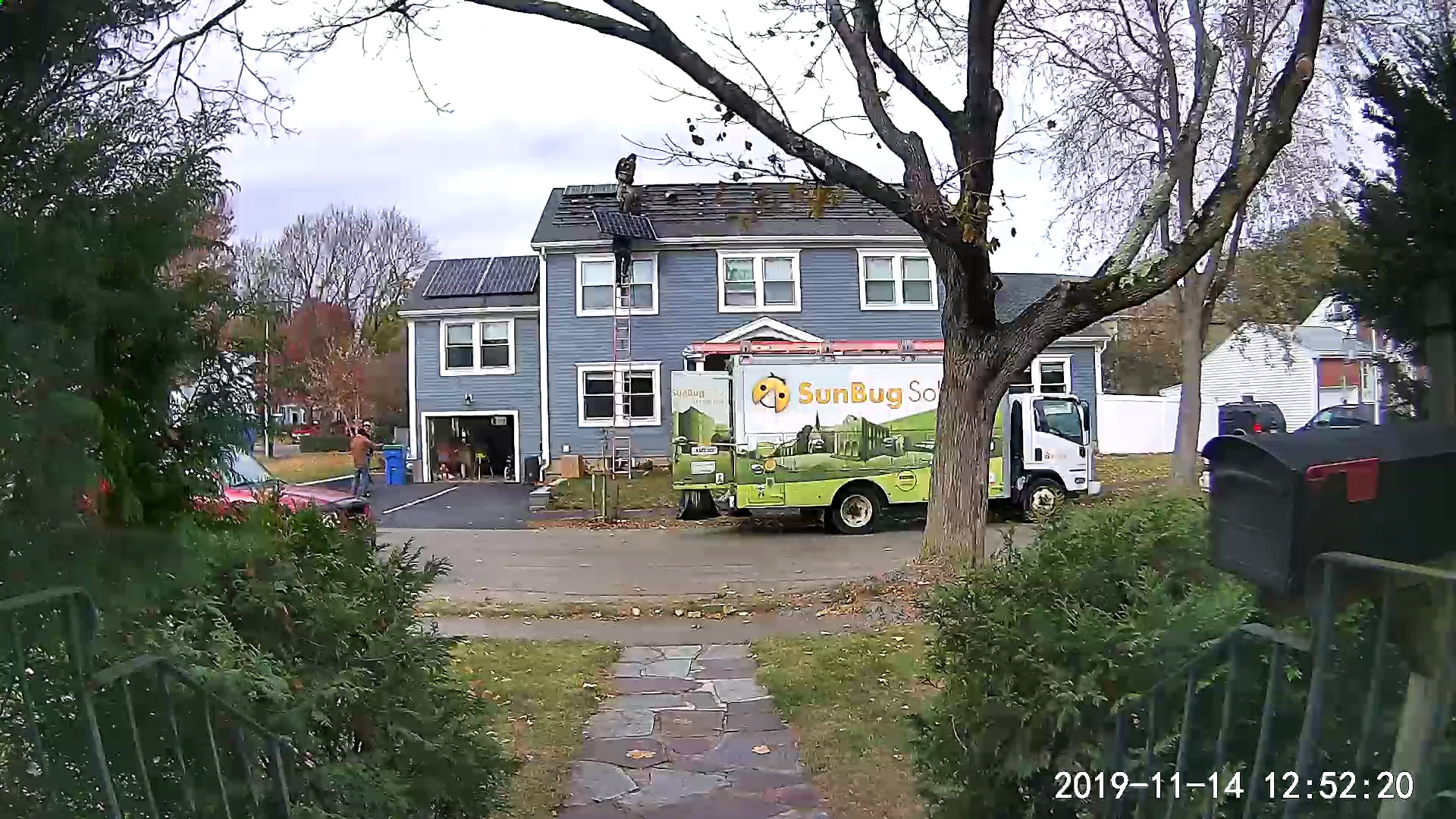 around noontime i casually took a peek at the webcam stream to see the solar contractors' progress, and was shocked to see they were already putting up solar panels. but how? i called my father to let him know what was happening. he said mostly likely the panels were already there, just in the backyard (where i couldn't see it) instead of in front of the house. i quickly remotely set up a time lapse video, 3 seconds a frame (3 seconds is the lowest setting on the wyzecam). it's actually kind of ironic, the best view of our neighbor's new solar panels is actually from our house. his roof is high enough that he won't ever really get a good look at his panels, at least not as good a view as us.