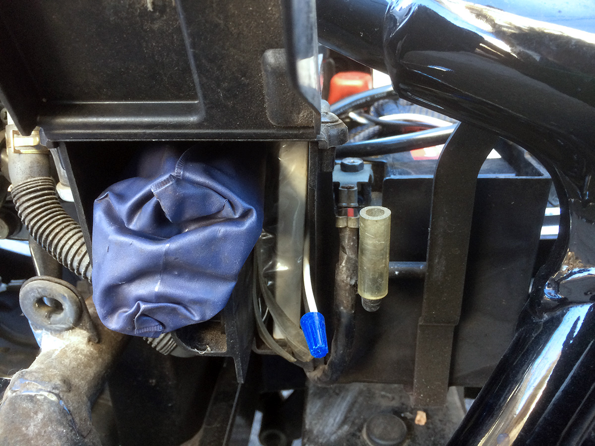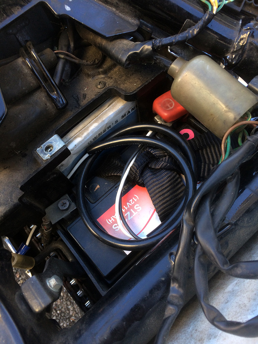 when i got back home i rerouted the positive terminal cable so it fed through the toolbox shell below. this would allow me (in theory) to jump start the battery without having to remove the bike seat, which requires an allen wrench. the toolbox on the other hand came be easily opened with the bike key. i'm going to be ready for the next time my motorcycle battery dies on me.