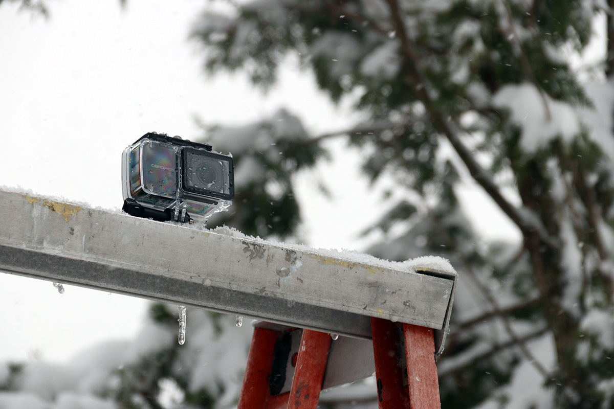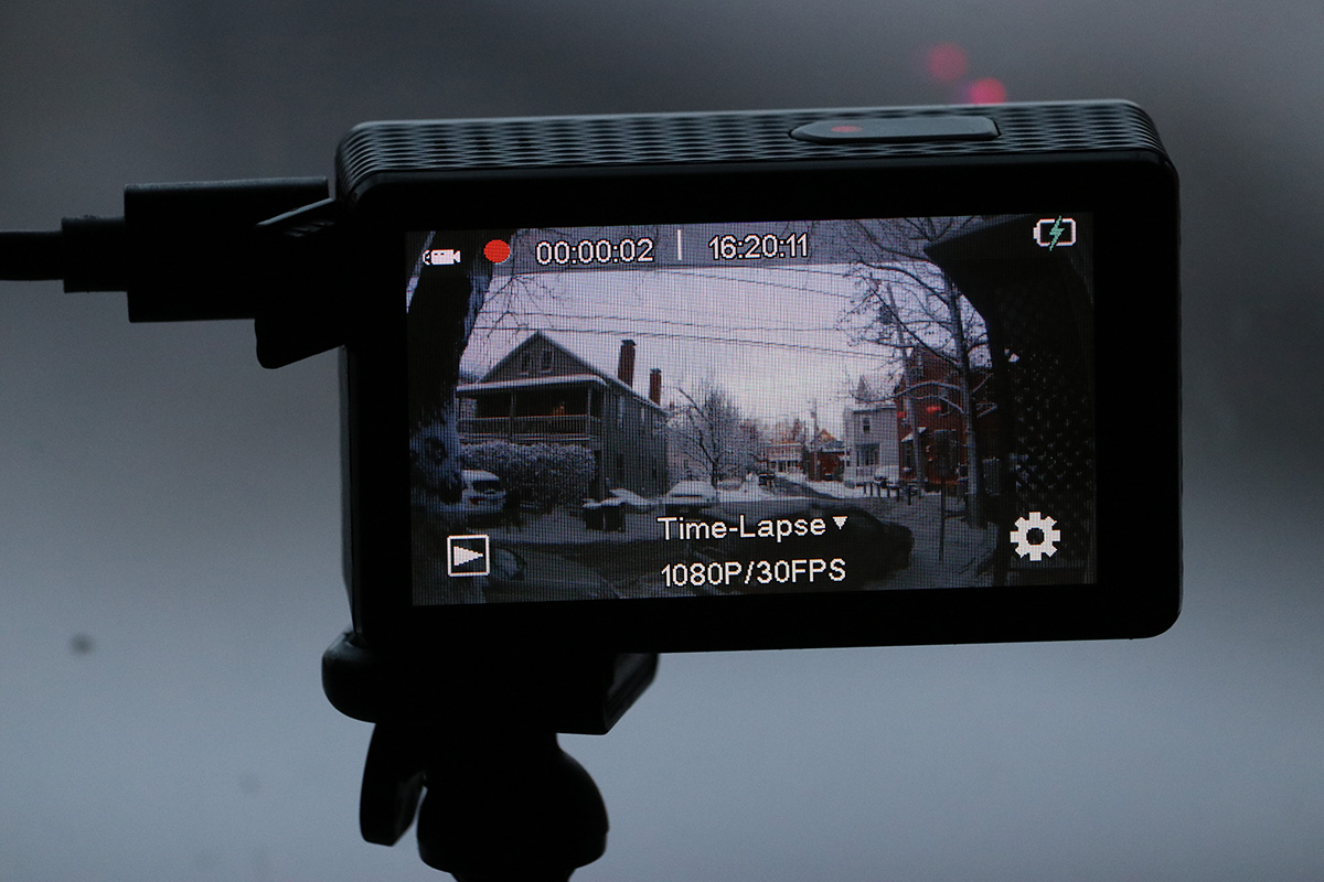 i'd brought my new EX7000 pro action camera to take a time lapse of the cleanup. the one caveat was i couldn't use an external power bank when the camera is inside its waterproof housing, which meant i only had an hour's worth of battery. there's only a few options for the time lapse duration: 1, 5, 10, 30, or 60 seconds. i chose 1 second.