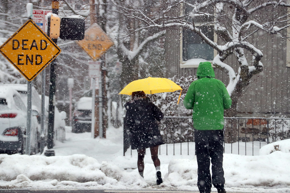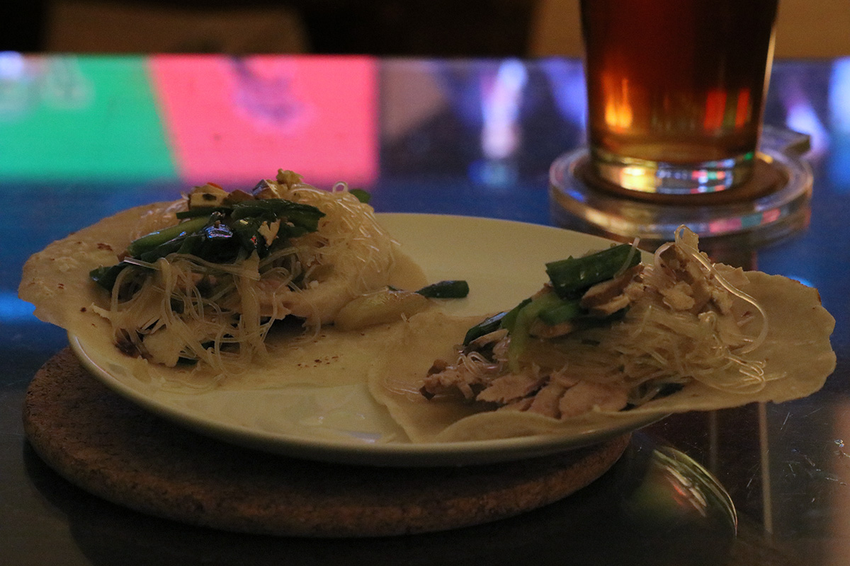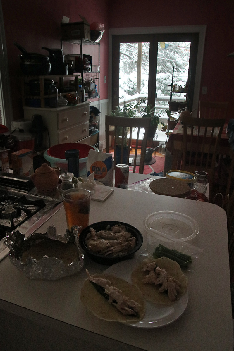 the snowfall this morning was more impressive. yesterday morning the snow that fell overnight was already getting soaked by the rain. the snow falling today was more pure snow instead of wintery mix, and easily clung to objects already soaked from the weekend. judging from the sidewalk condition, my upstairs neighbors must've done some early morning shoveling. for lunch i made myself some turkey rollups. i found out i did have hoisin sauce in my fridge.