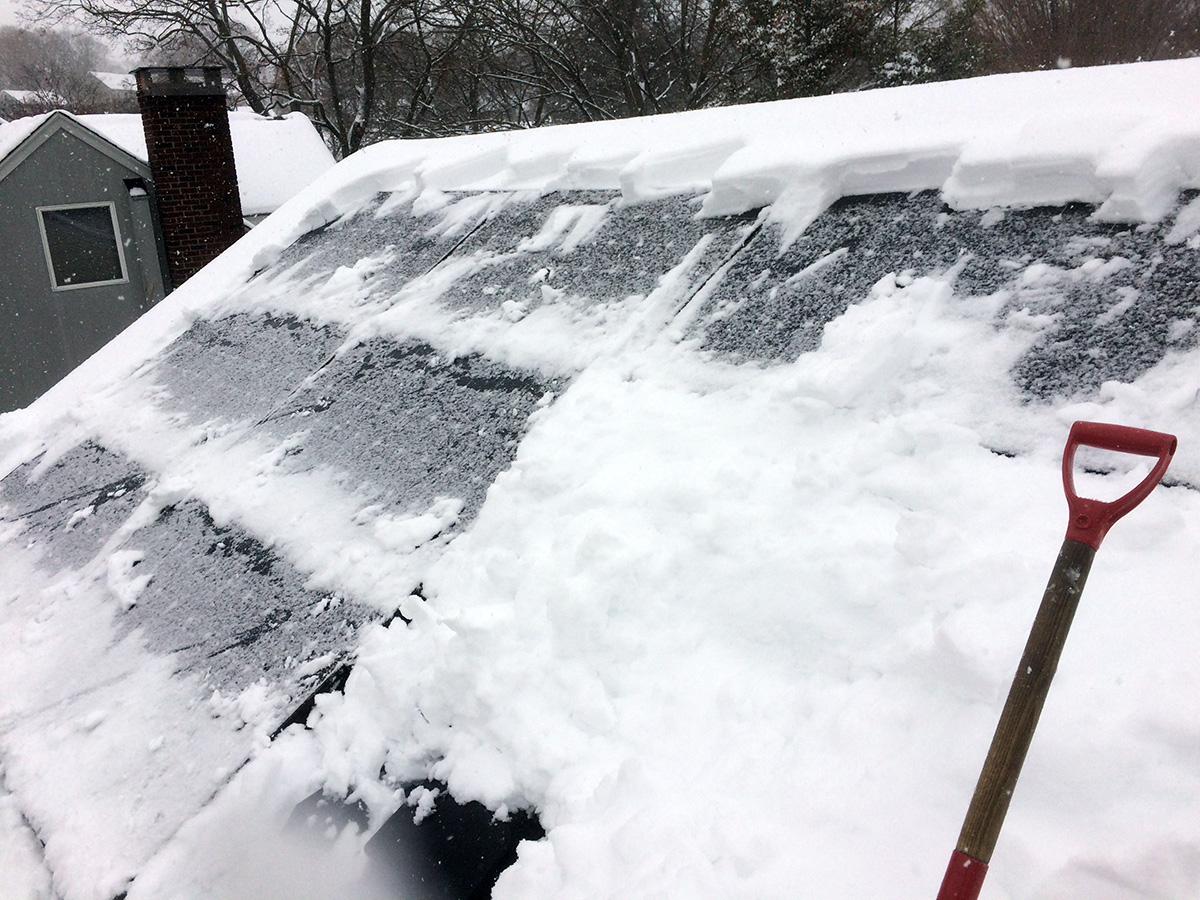finally i climbed the roof to access the areas i couldn't get to from the ladders. for this part i asked my sister to spot me, who'd been waiting inside for me to finish up so she can go home. i just needed her to pass me the tools and to hold the ladder when i came down. climbing the roof to clear the snow off the solar panels is a last resort because there's an element of danger involved (snow, ice, roof, not a good combination), but cleaning from the roof versus from the ladders is so much faster. if i could climb the roof to clean every single time, i could clear the panels in just 15 minutes instead of the hour plus it now seems to be taking me. with a shovel i cleared the snow trapped between the main roof and the sun room roof. i then used the foam roof rake to simply push the snow off of the panels.