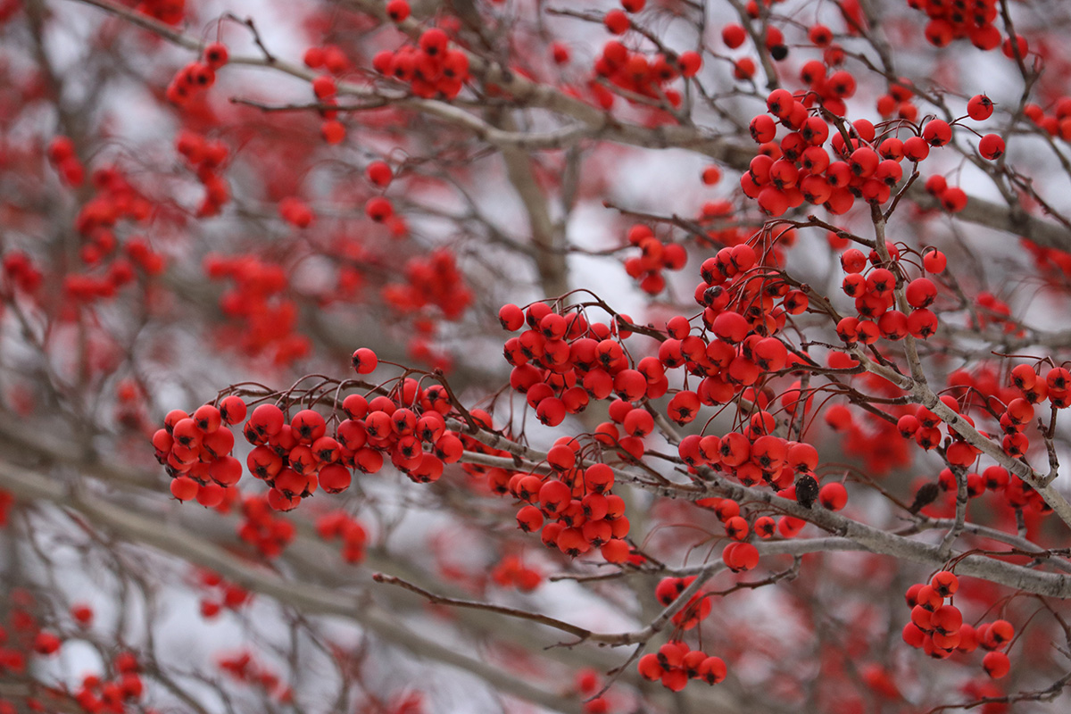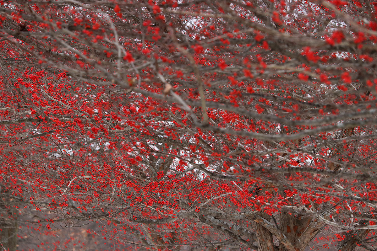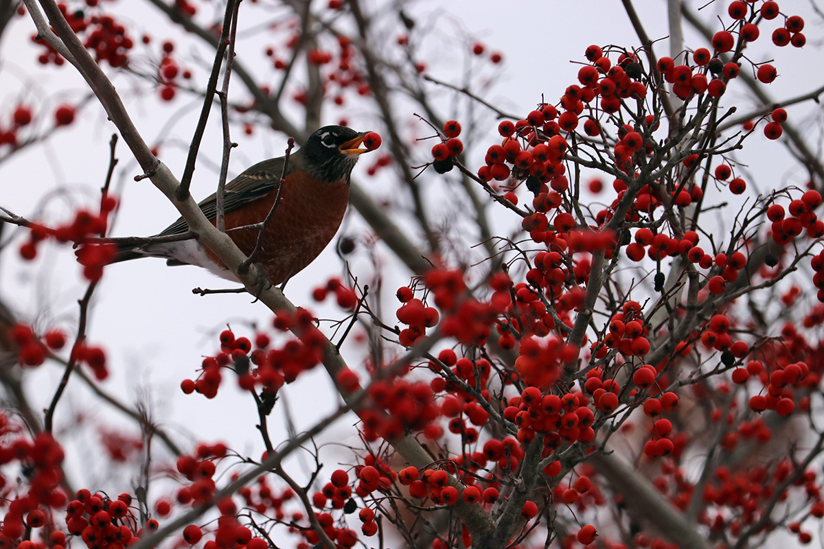 when i arrived at fresh pond opposite the honda dealership, i saw the winter king hawthorn trees right away. what i really wanted was a high contrast between the red berries and the white snow, but the paths had already been cleared, so the hawthorns didn't look their best. i got off my bicycle and took some photos. a bunch of robins descended onto the trees, eating the berries.