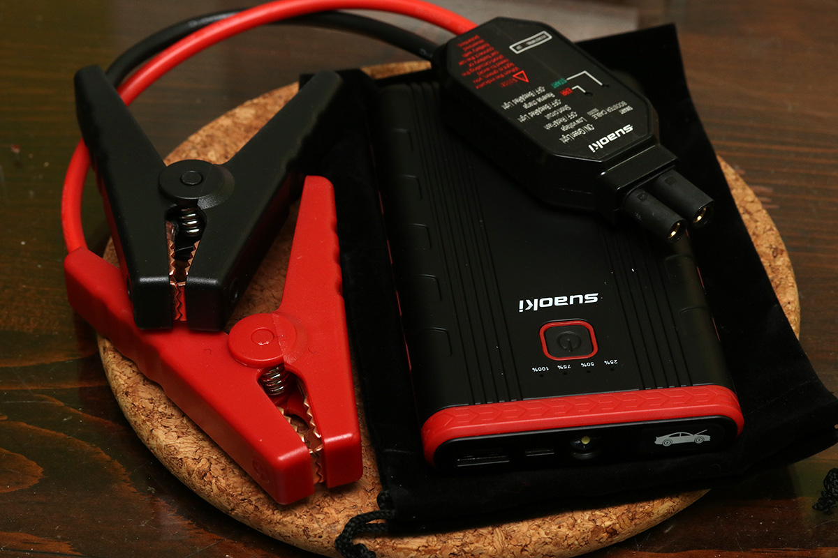 my suaoki U3 400A jump starter was waiting on the doorstep when i got home. smaller than my smart phone but 1.5x as thick, it's also much lighter compared to my other jump starter. this one seems a lot easier to carry around, although the EC5 jumper cable is still this large dongle of wired alligator clips and jump start circuitry.