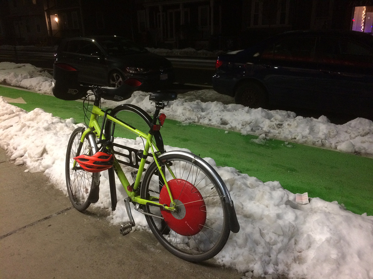my parents were worried how cold it was getting outside (26°F) but i've biked in colder temperatures. the secret is wool mittens, which i packed in my bag but didn't use this morning. with mittens my fingers didn't freeze and i slow-pedaled back to my place, not particularly concerned about the cold. unfortunately my headlight ran out of juice again and i rode in the dark. i still had rear lights - on my helmet and on the bike - but oncoming cars had a hard time seeing me, especially if they were making left turns at intersections. i vowed to order a new headlight when i got home, one that can warn me when i'm about to run out of battery.