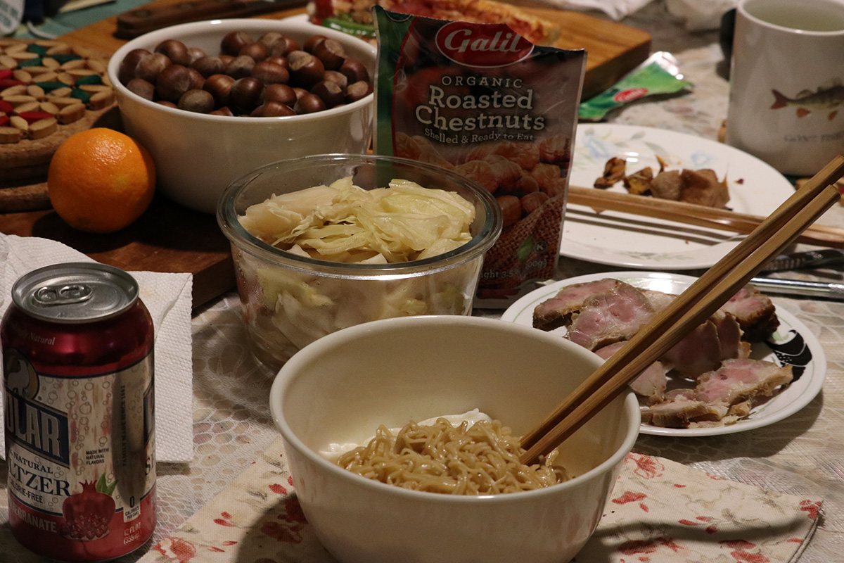 later in the evening my father prepared some taiwanese ramen for dinner. my mother kept saying how delicious the choya plum wine was, and promised she'd get a big bottle the next time she visits a liquor store. she said it reminded her of the holidays in taiwan, when they'd drink plum wines like this.