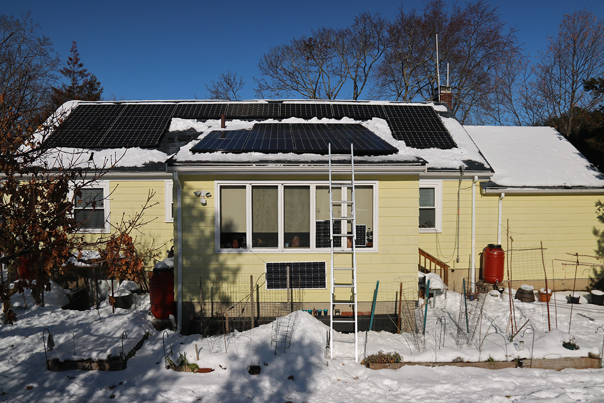 the wind chill was in the 20's but the only thing that hurt were my fingers, i was otherwise bundled up. apart from the cold, it was a nice day for a bike ride, the sun once again shining up above against a deep blue sky. when i got to my parents i was happy to see that about half of the neighbor's solar panels were still covered in snow. if only they weren't too proud to have asked us for advice, we would've warned them about leaving such a large gap at the bottom edge of the roof that the naturally sliding snow off of the solar panels would all get clumped together and stick. it's a common design flaw, we see it with a lot of installs, it's probably a safety and installation feasibility issue. my father actually went out into the backyard this morning and cleaned off the light layer of snow that fell yesterday.