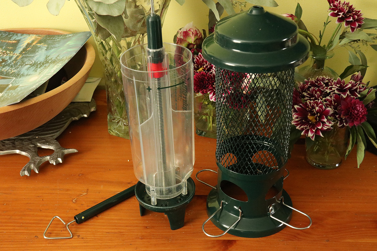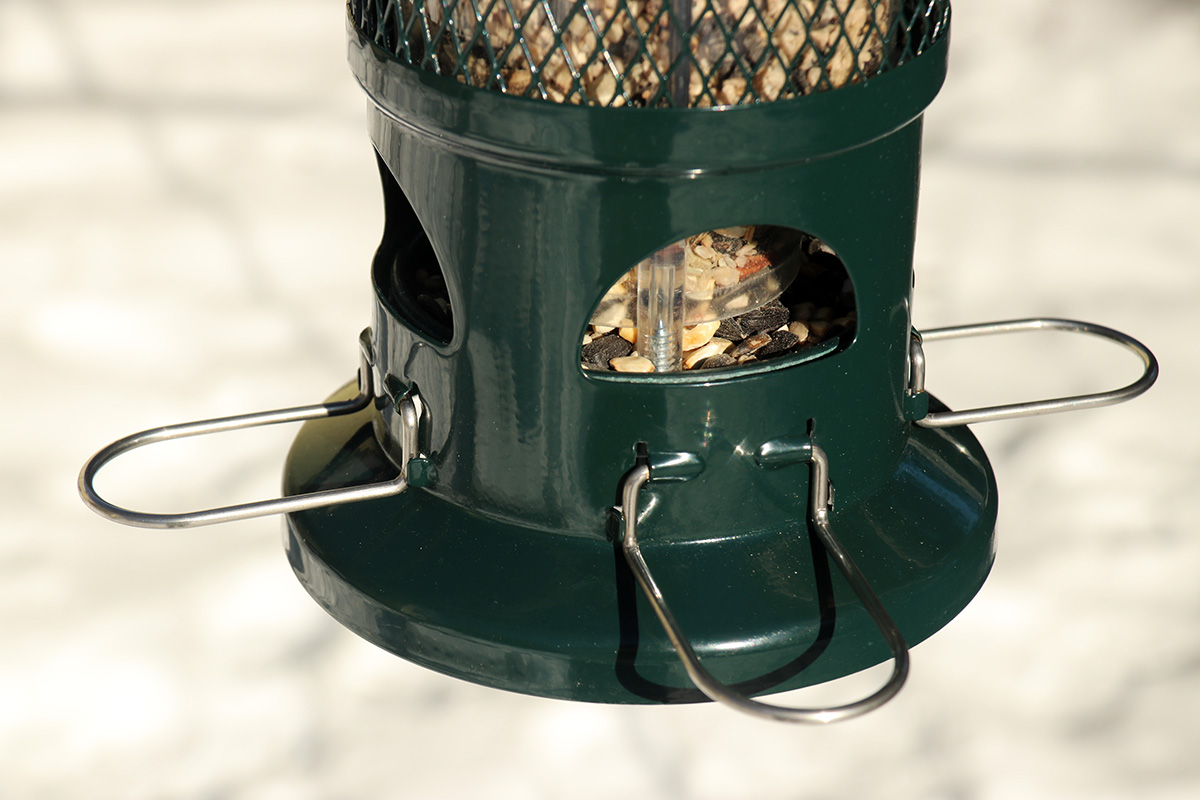 i came with my package of the squirrel buster standard ($28) birdfeeder which arrived this morning. i eagerly opened up the box to set it up. just as i suspected, it was an open-boxed item, hence the cheaper price. everything was included, but it looked like it'd been used, there was water spots on the inner plastic insert and bird seed dust on the base. there was also a few scratches on the insert, but nothing that was visible when assembled, and i'm sure there'll be more "bumps and bruises" once it's put outside. the standard is one of brome's smaller feeders, holding just 1.3 lbs. worth of seeds (only the mini holds less at just 0.98 lbs.). i think it's just the right size, not too small and not too large. i had some bags of bird seeds in the basement but they were old and i felt a little bad using them. they were also a mix, so besides black oil sunflower seeds, there was also millet and cracked corn.