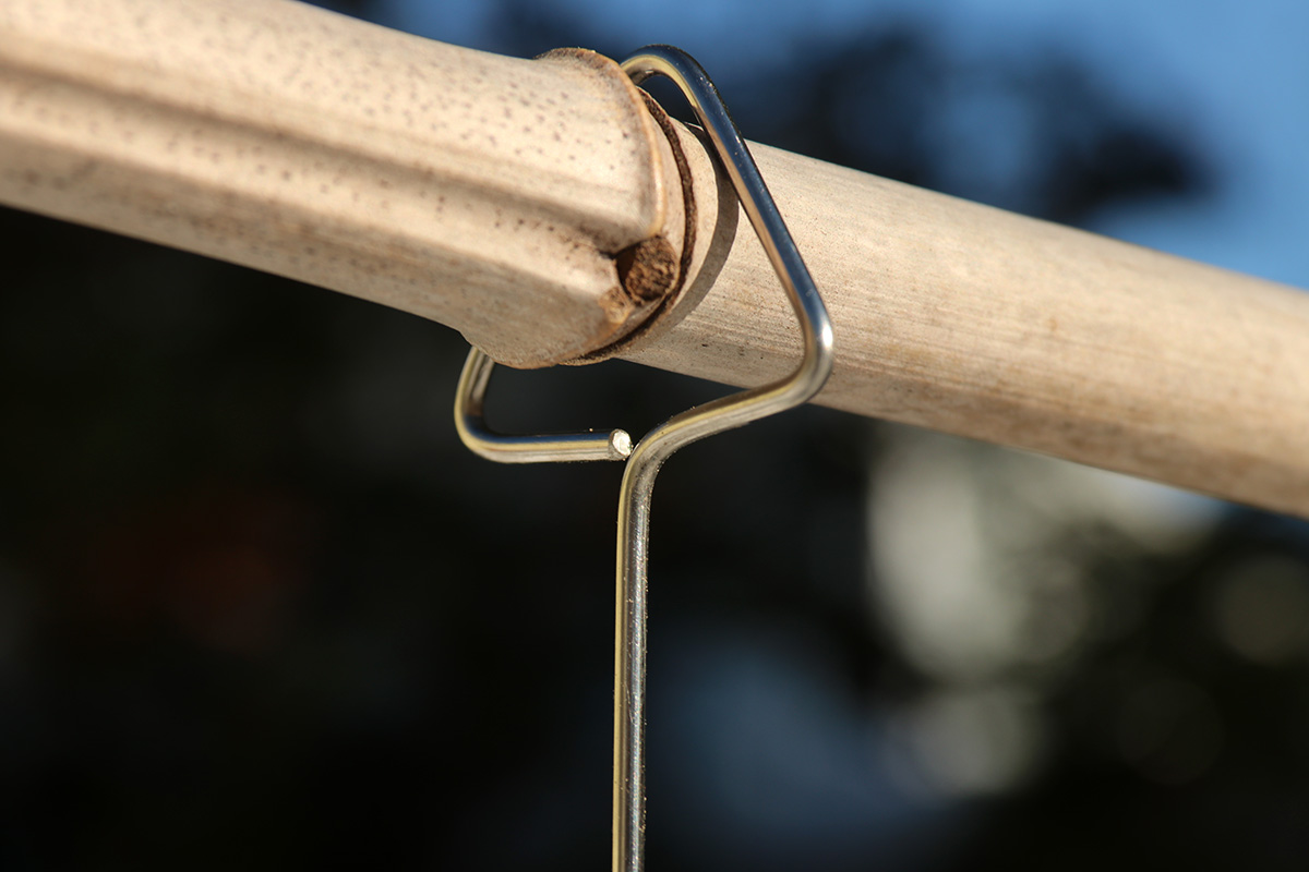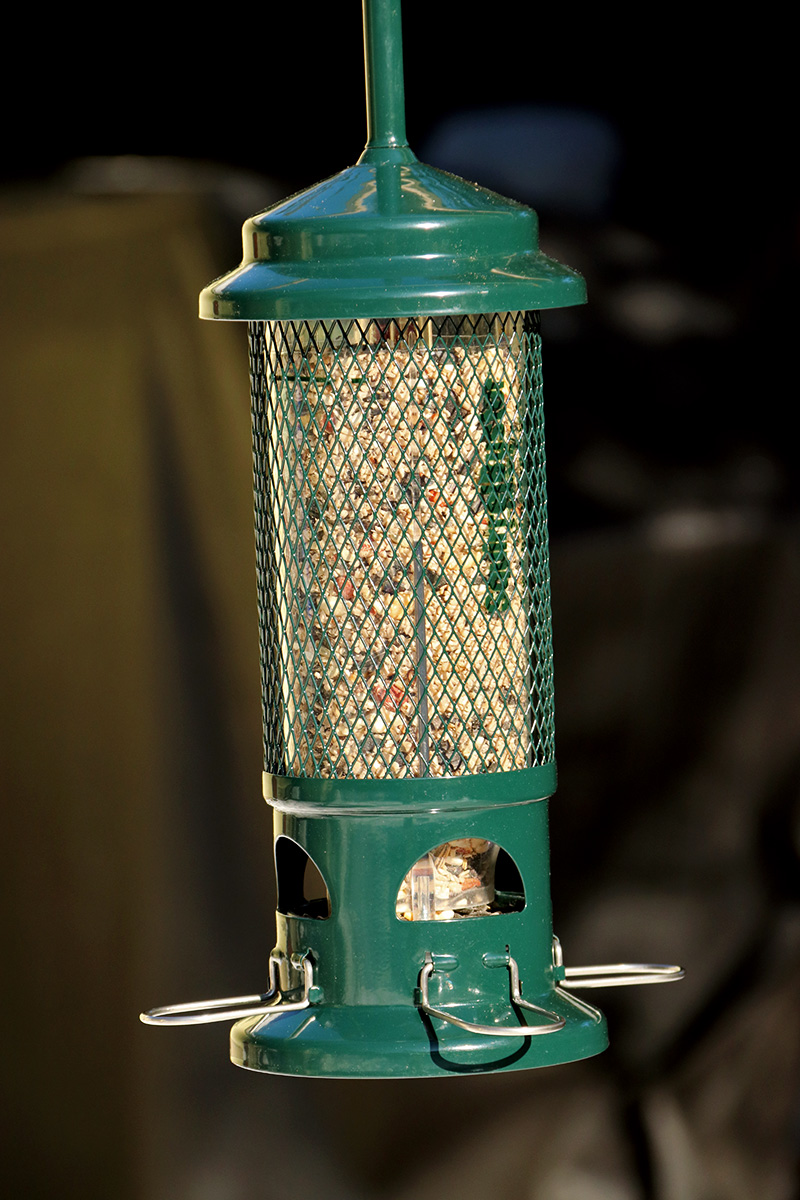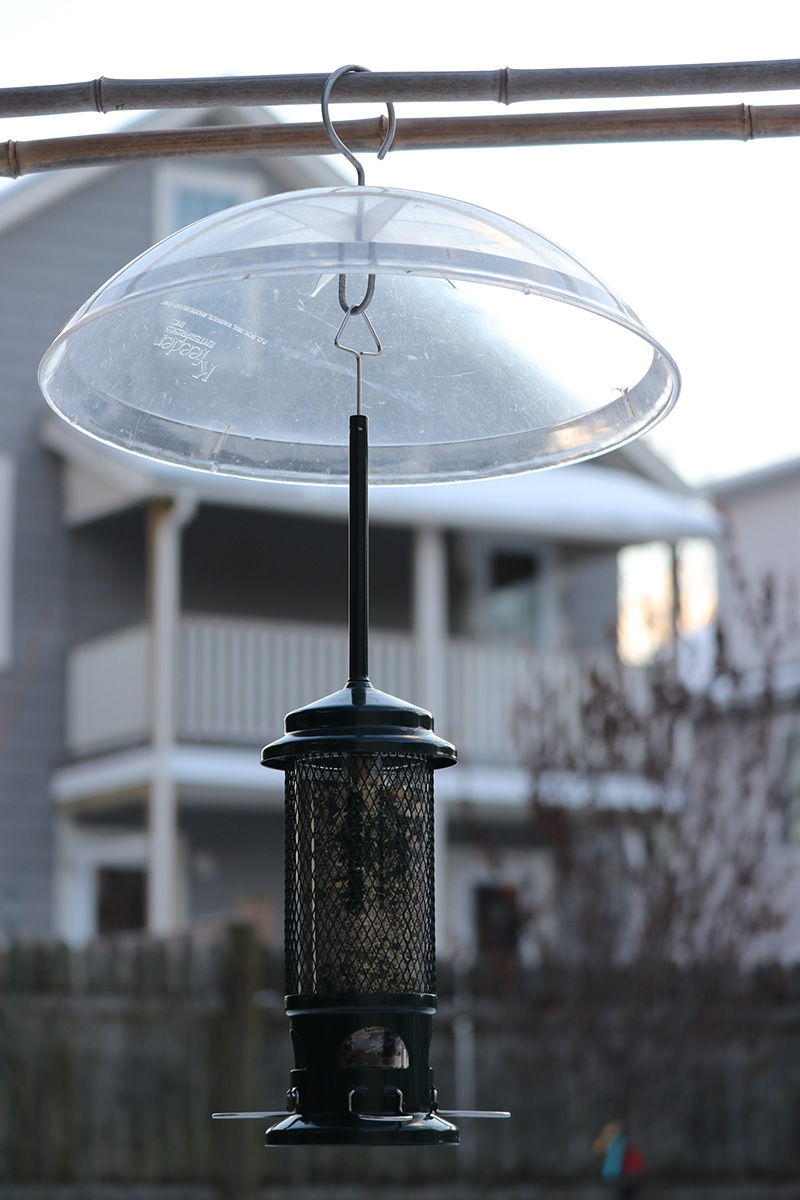 i hung the feeder outside, it's hanger suspended from a long bamboo pole between two shepherd's poles, with more than enough clearance (18"+) that squirrels can't get to the feeder by hanging off of something else. later i added a clear baffle to keep off some of the rain and snow, even though the feeder extends far enough it's still not entirely protected from the elements. now we wait for the birds to come. the backyard used to be very bird friendly before we chopped down the dead plum trees which removed a place for birds to shelter. since then we planted new trees which will hopefully encourage more birds to visit. there are definitely birds in the backyard because we provide them with bird baths during the warmer months. as long as the temperature isn't freezing, birds can come to drink and bath.