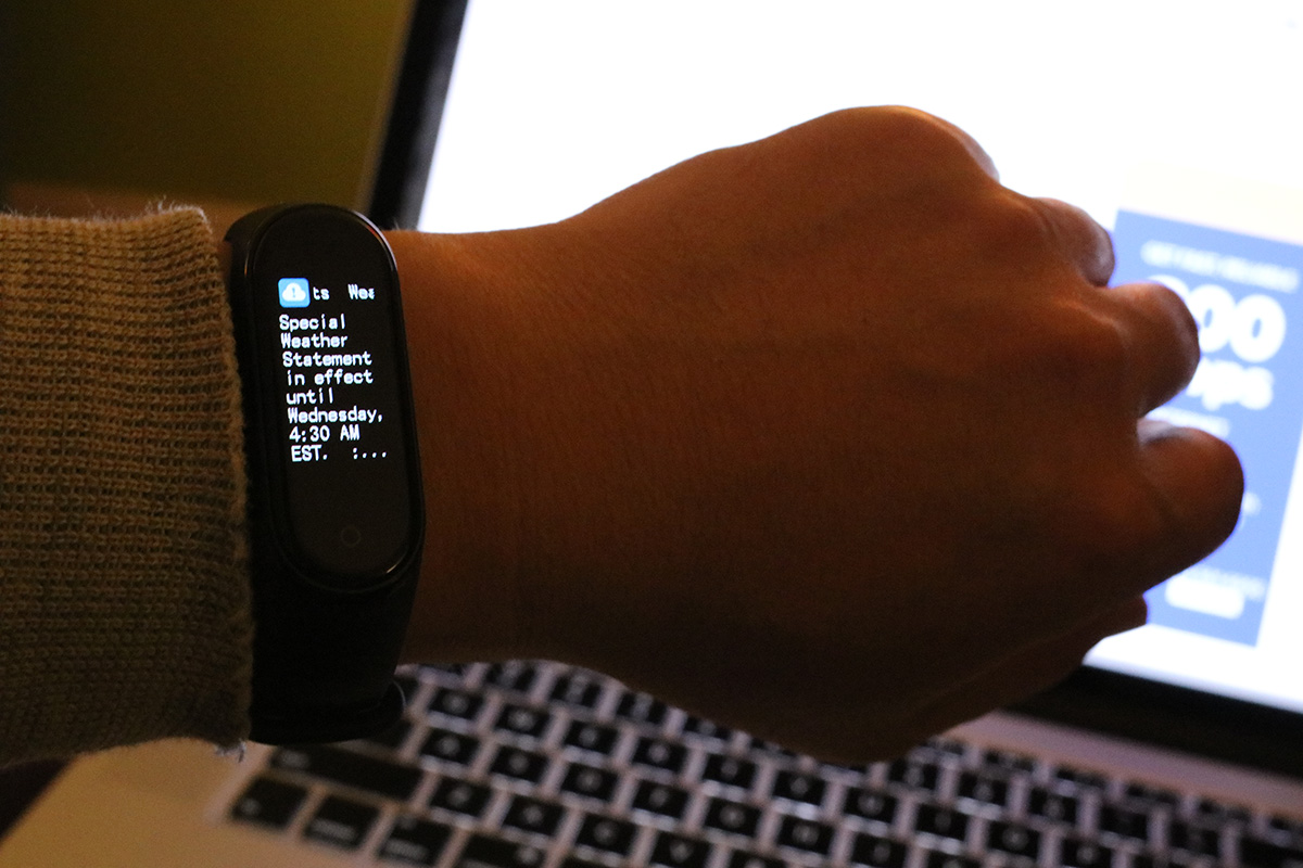 i also changed the watch face of the fitness tracker using a mi band 4 watch face customization app. there are so many different styles, i almost want to try them all. another cool thing that happened tonight was the mi band 4 sent me a special weather reporting because of the snowstorm we're due to receive tomorrow.